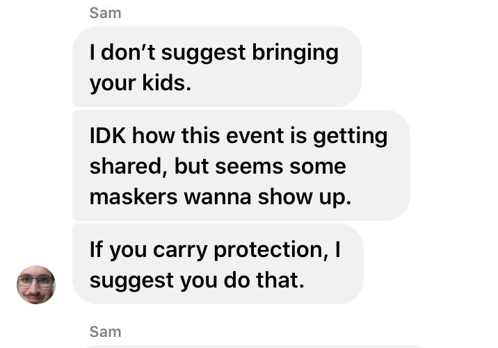 Sam Walker, who organized Saturday’s No Mask Protest Walk-In, tells followers, “If you carry protection, I suggest you do that.”