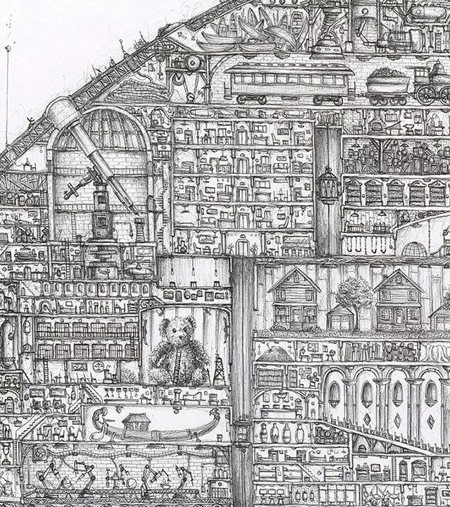 Remember M.C. Escher? He was a graphic designer before there was such a thing as graphic design. In 2017, he has a Dallas-based contemporary named David Canright, whose large-scale drawings feel like distant cousins of Escher’s but are more cartoonish and etched entirely in ballpoint pen. His farcical drawings, which are primarily structures, poke fun at the arrogance of the modern compulsion to build higher, bigger and taller. At the same time, his pictures celebrate the childlike hopefulness that supersized buildings have come to signify. Canright graduated from the University of Texas at Austin, where he studied painting.