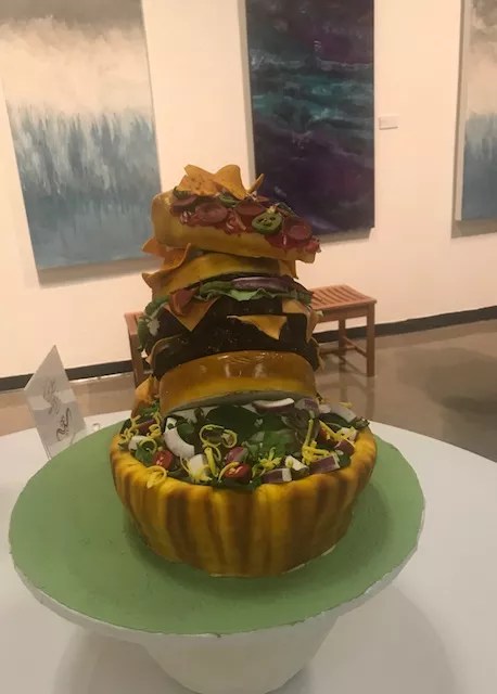 “I feel like it’s my social commentary on dieting,” Katie Kennedy says of her multilevel sculpture in this year’s Eat Your Heart Art exhibit. “We would all eat more salads if it had hamburger and pizza on them.”