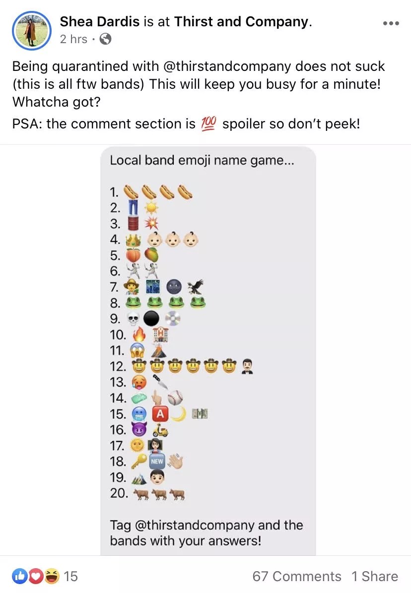 Here’s a fun game. Guess the local bands based on the emoji and leave us your own in the comments. We could do this all day. Literally. Sob. Shea Dardis