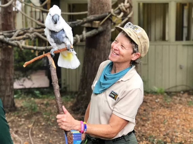 “Through that time, my outlet was to come here, and I thought this was just wonderful,” Fitzpatrick says. “So then I had enough education with my degree to get hired into the Department of Education, and then I just got more and more experience. Every time I had downtime on the train, I volunteered to work with mammals and birds. Then I had enough experience to then work in the bird department.”