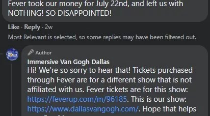 “Hi! We definitely do not have tickets for sale on July,” wrote a representative of the Immersive Van Gogh Exhibit in response. “There are two different exhibits that are not affiliated with each other coming to Dallas.”