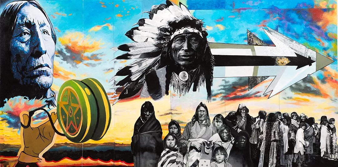 The collection is a catalog of what he says has defined American history, and reflects major historic events with their contemporary counterparts. One piece draws on moments such as Native American on the Trail of Tears, related to the current government’s executive order to advance construction of the Dakota Access Pipeline.