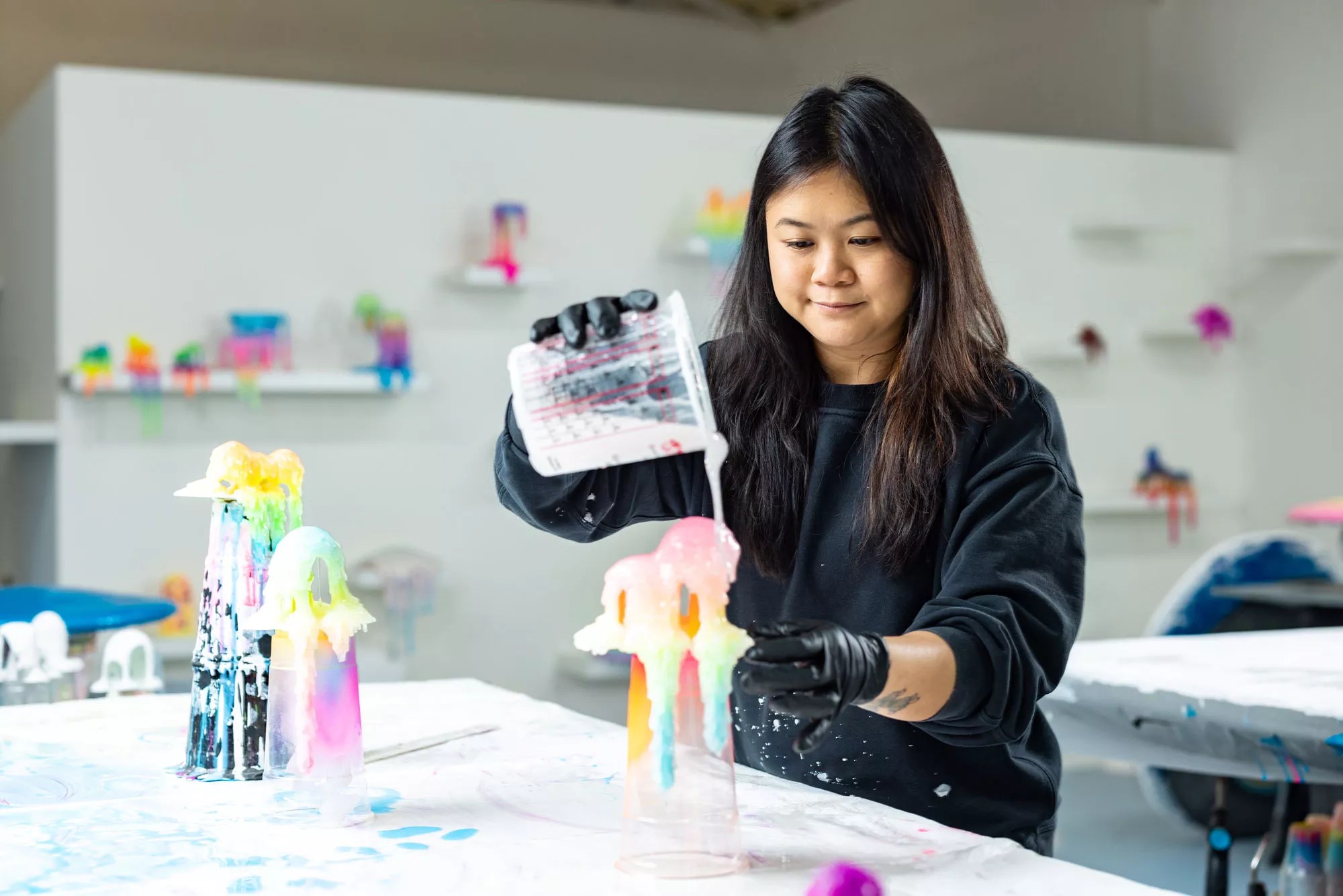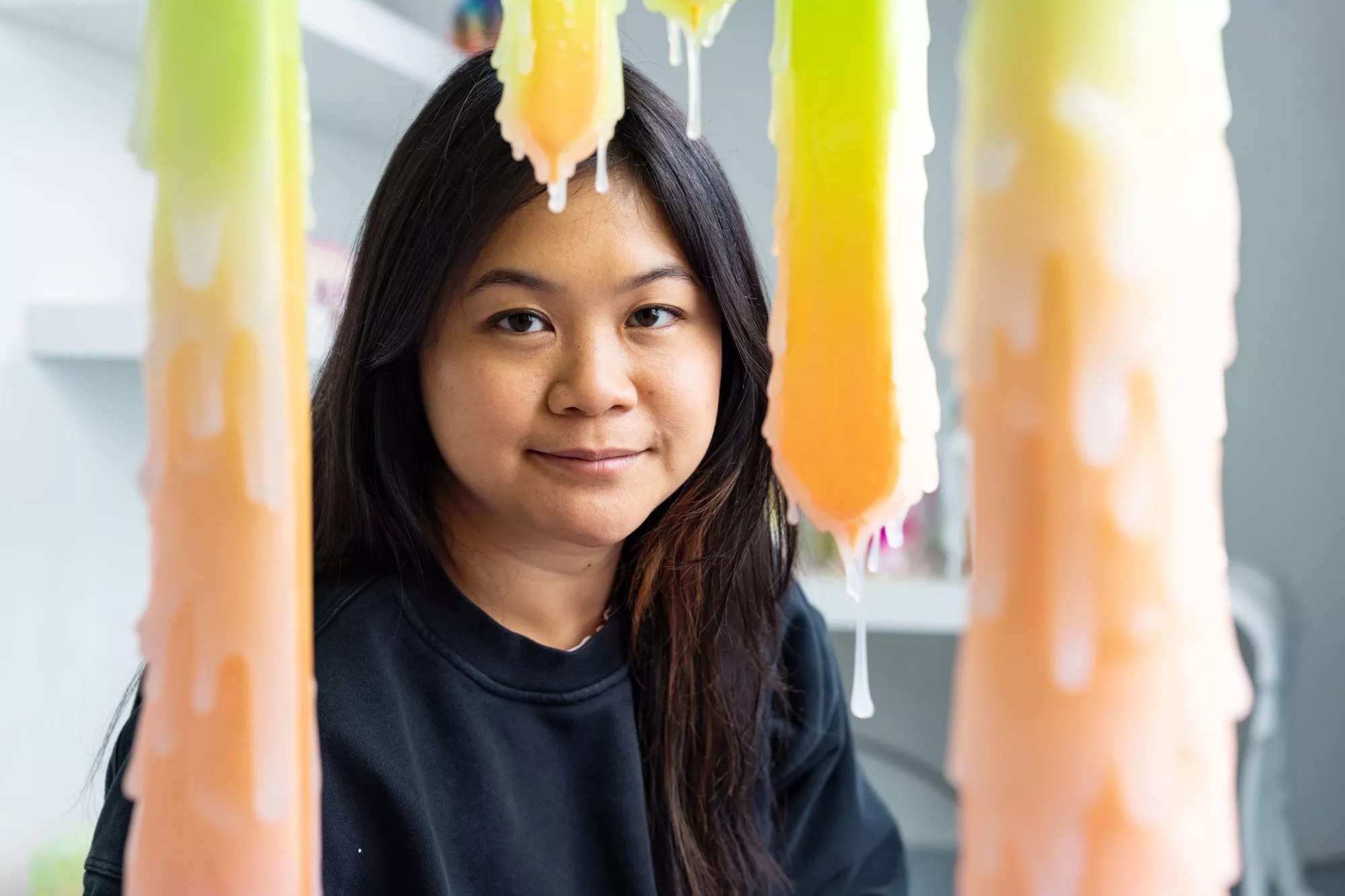 Dan Lam’s sculptures look like they were dropped on Earth from another planet. Enchanting, otherworldly and vibrant, her art flops off shelving in the form of drips, as blobs that colonize walls with neon color and as squishes climbing into iridescent towers.