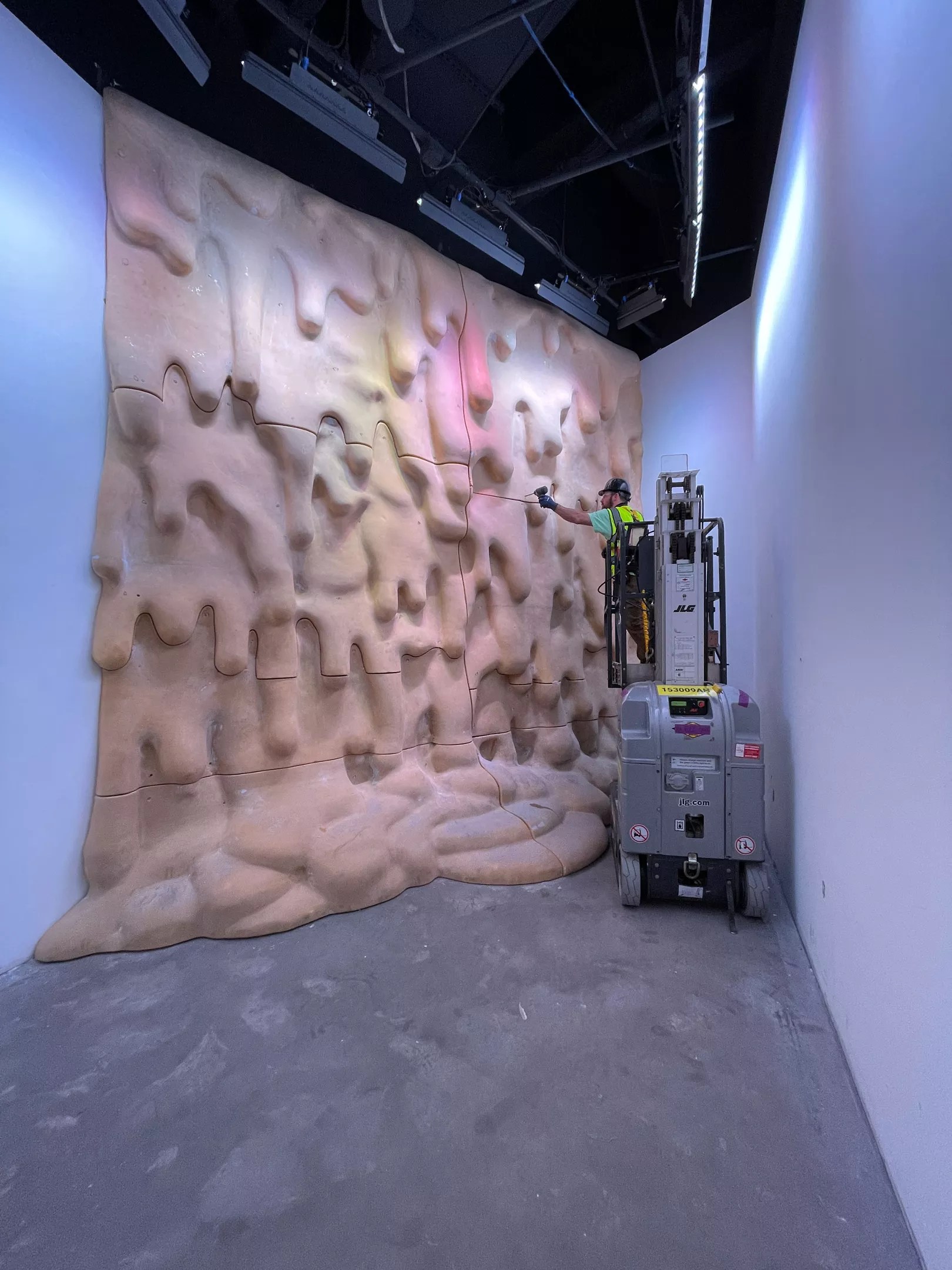 “My paintings were very textural and thick [in grad school],” she says. “I was still working on the wall, but I would definitely call them sculptures. At that point in time, I was using polyurethane foam, which is still one of my primary materials – I’m obsessed with it. A lot of time, it was just about me exploring the material. I thought [it] was so cool. Within my own explorations, I was like, ‘How can I can push it and make it do different things?'”