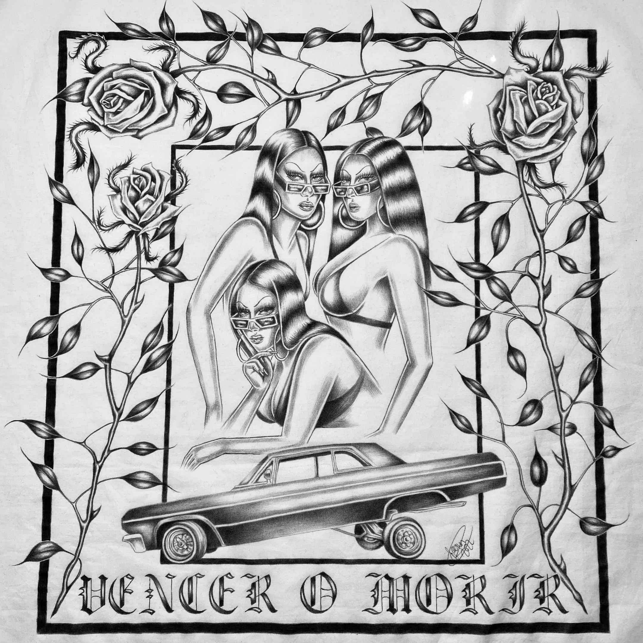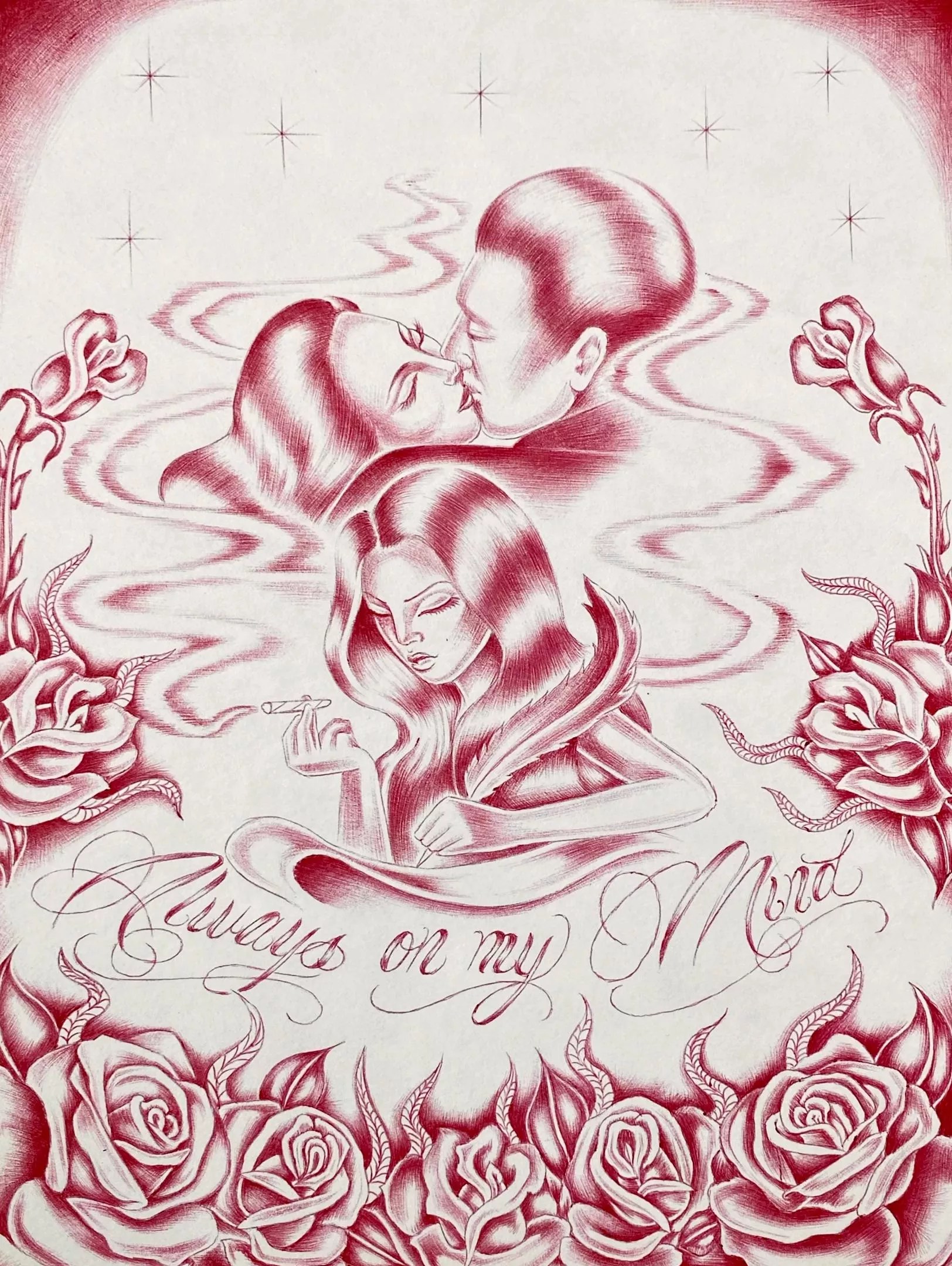 She began to incorporate her classically-trained realism with Chicano tattoo style and elements of surrealism. She started to post the work on Instagram under the alias Clean As Paper in 2016, where she built a cult following with drawings of Dobermans, femme-centered portraits and classic cars. In addition to urban tattoo culture, Rodriguez draws strong inspiration from Mexican-American paños, the tradition of ballpoint pen drawings on cloth handkerchiefs originated by prison inmates in the U.S. Southwest. It’s an affinity deeply instilled in her family history.