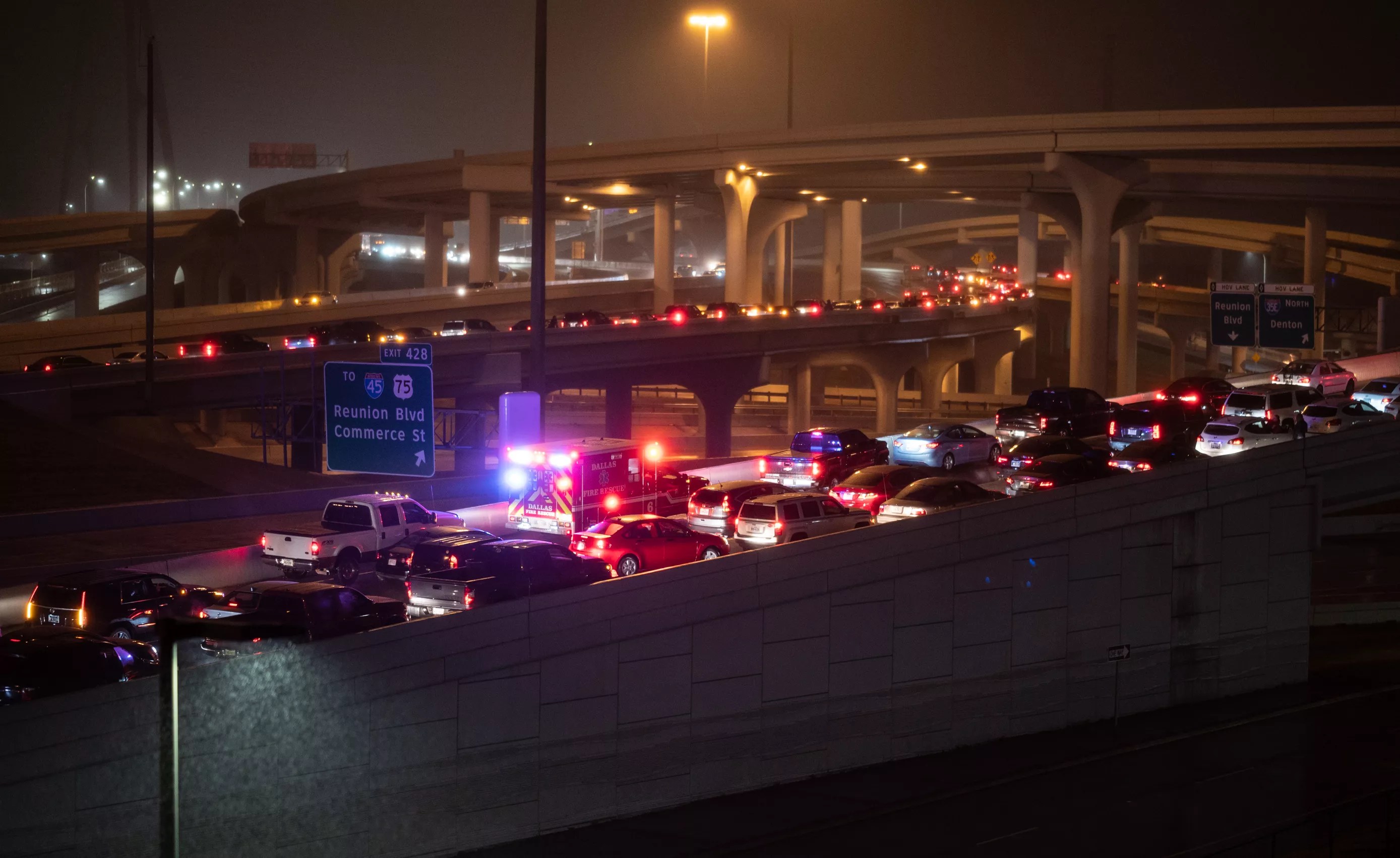 Looking to the east, a full two lanes of traffic on the Interstate 35 just stopped and put on their blinkers. An ambulance heading to Parkland struggled to get through the remaining lane, its horns and sirens sounding like those crazy NYE party favors. I’m not sure who the first person to come to a full stop on the city’s most dangerous stretch of road was, but he/she/they certainly have some big ones.