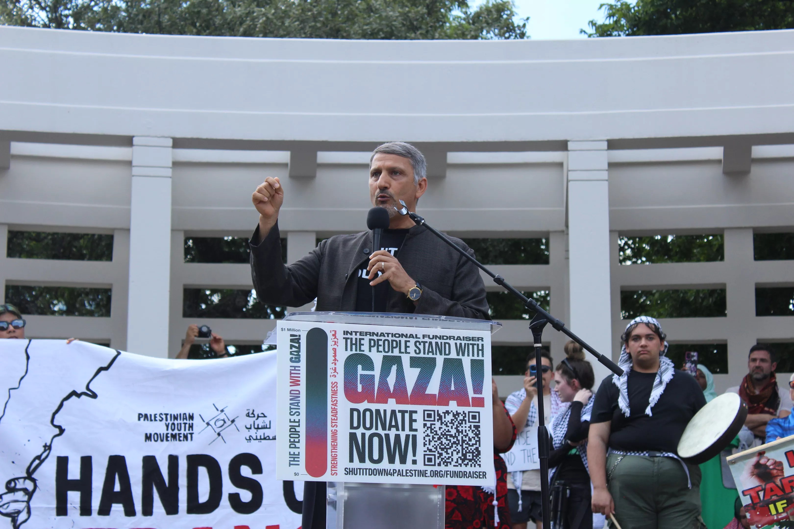 After the organizers led the crowd in chants, Unviersity of California Berkeley professor Hatem Bazian was welcomed to the podium and addressed the audience. Bazian spoke about the dangers of xenophobia and criticized Western governments for its role in the ongoing violence in Palestine.