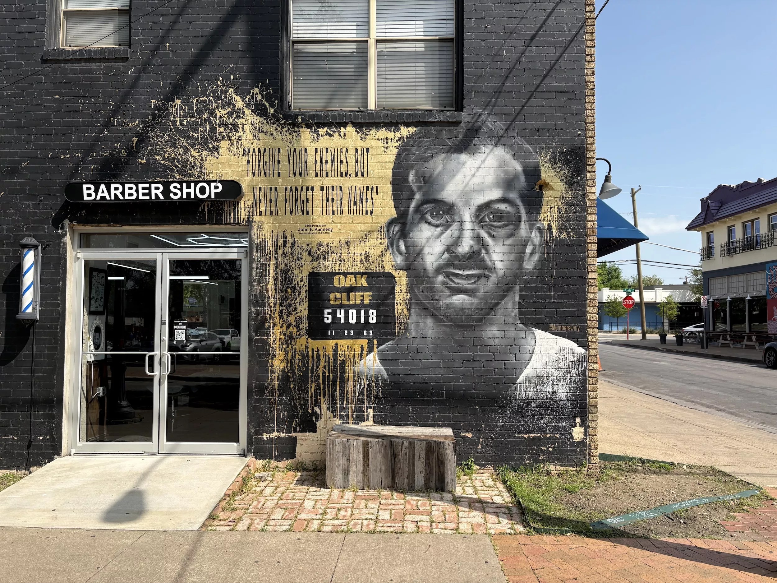 Local art legend Ponchavelli painted the Oswald wall mural in Oak Cliff with the quote: “Forgive your enemies but never forget their names.”