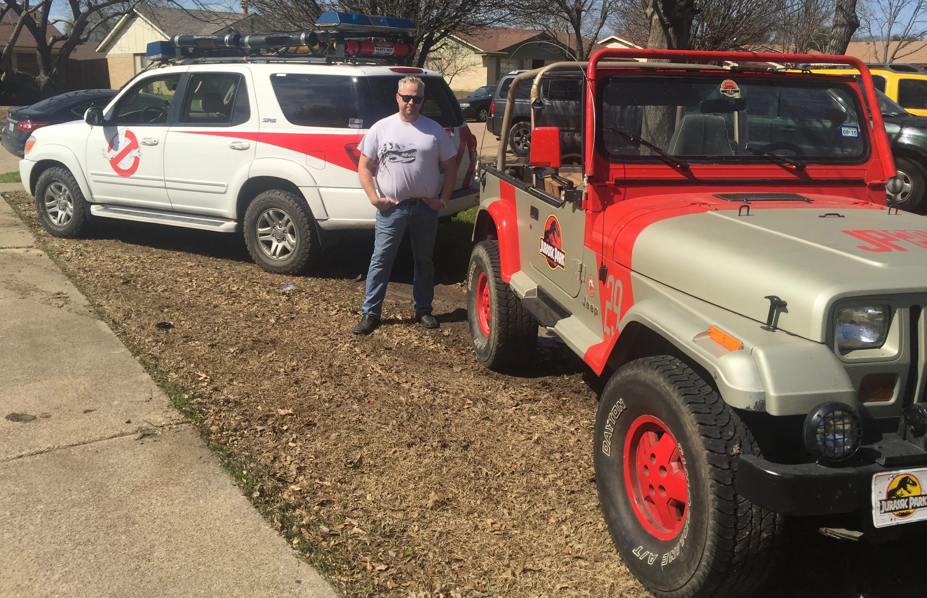 He headed to the kitchen, peered into the open garage and caught glimpse of what looked like the head of a man hiding under his Jurassic Park jeep – the second movie car he built, which earned him a spot in the Jurassic Park Motor Pool Car Club. McDonough says he originally painted the car so his wife could drive it, but he eventually persuaded her to let him turn it into another movie car project. He rebuilt it before putting on the Jurassic Park logo and stickers.
