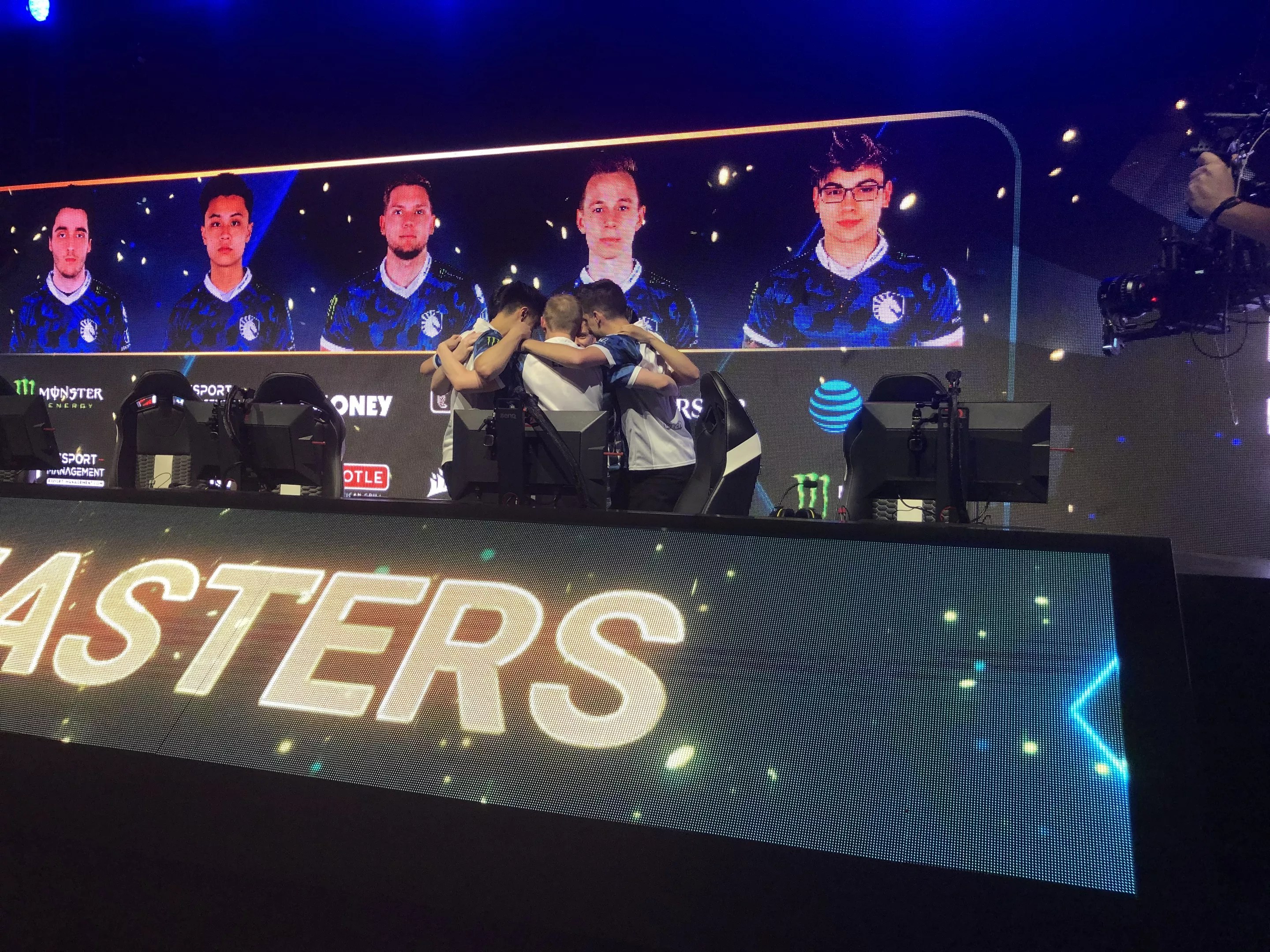 Team Liquid take a solemn moment to celebrate their hard-fought victory against Team ENCE in the DreamHack Counterstrike: Global Offensive Masters tournament.