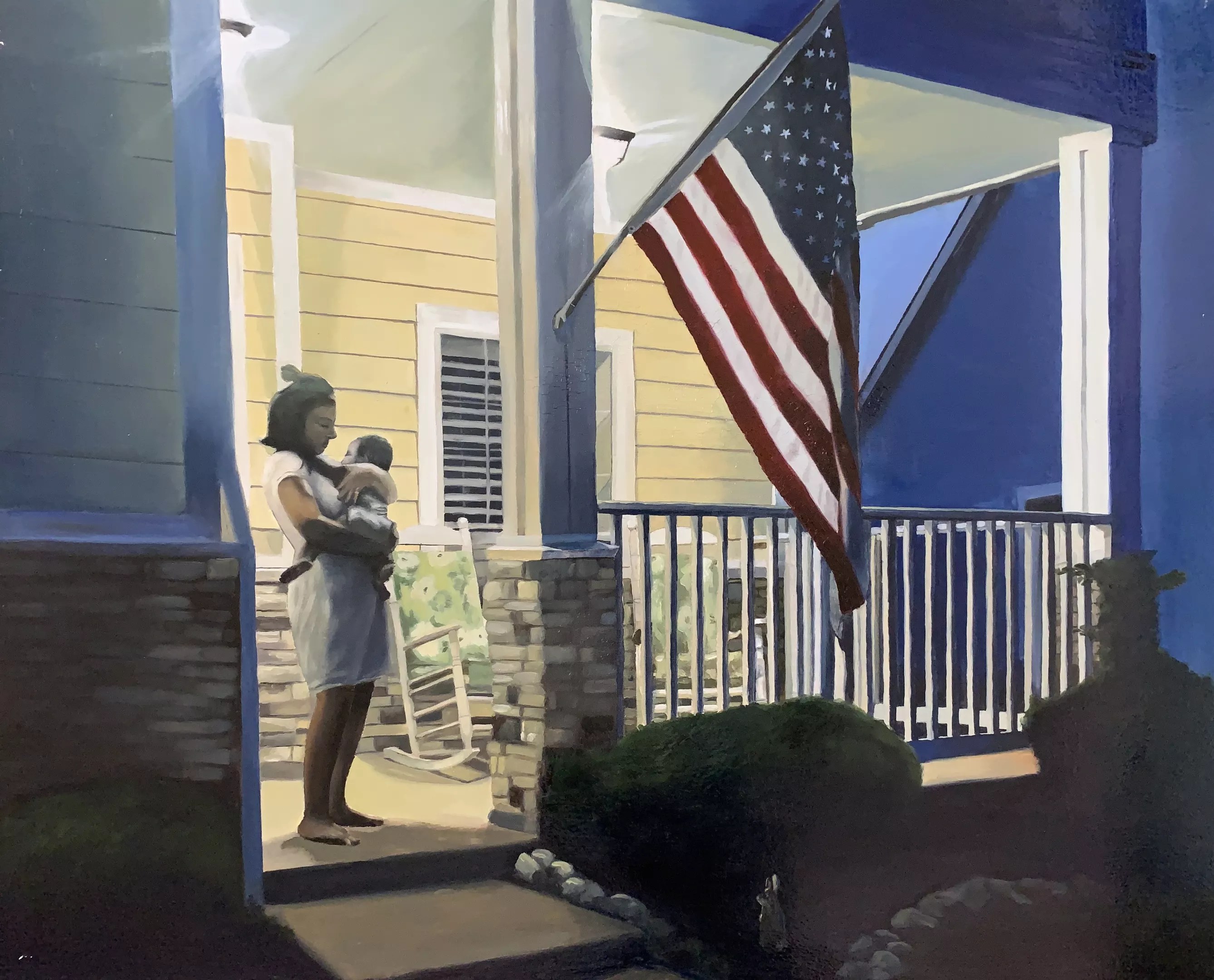 Another piece holds a significant place in the artist’s heart. It’s a 24×30 oil-on-canvas titled “On a Summer Night.” The oil painting is a realistic portrait of his then-wife holding their 7-month-old daughter on their porch. It’s a hot, peaceful summer night. The porch light illuminates the mother gazing at her daughter. A large American flag sways in the breeze. The scene is serene.