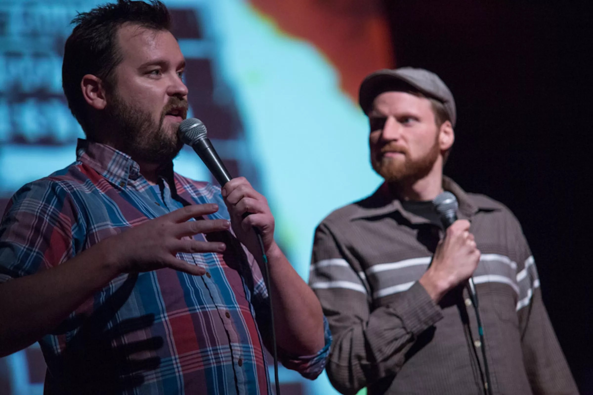 Found Footage Festival hosts Joe Pickett, left, and Nick Prueher, right, have amassed a collection of strange, quirky and unusual videotapes that are “literally stacked to the ceiling,” Prueher says.