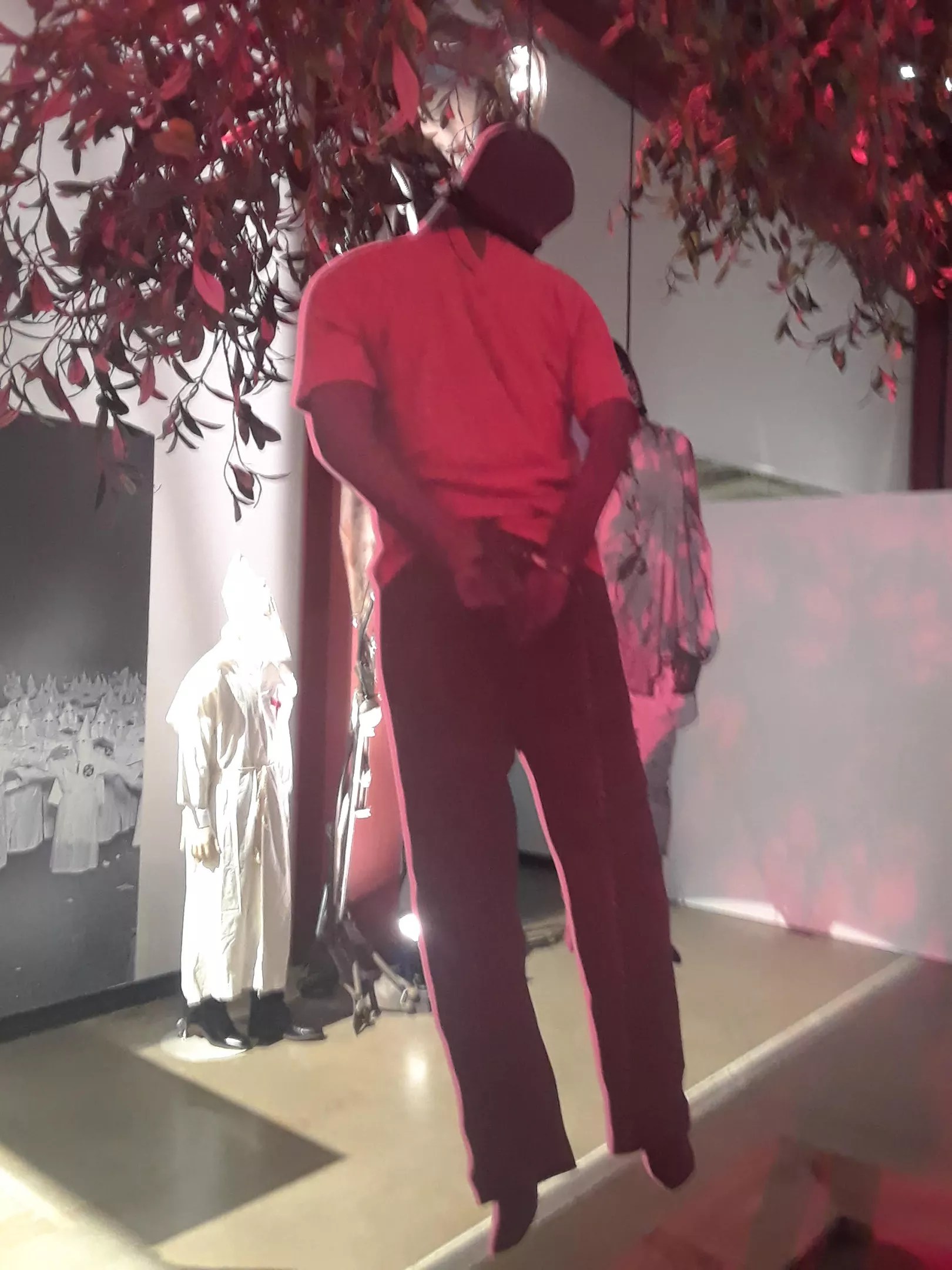 In the exhibit, department store mannequins wear Klu Klux Klan outfits. One was dressed as an ISIL fighter. Armed with an AR-15, he stood next to what I assumed were two journalists he planned to behead after the party. They were wearing orange jail threads and were locked in a cage from Marvel’s Thor Ragnarok movie.