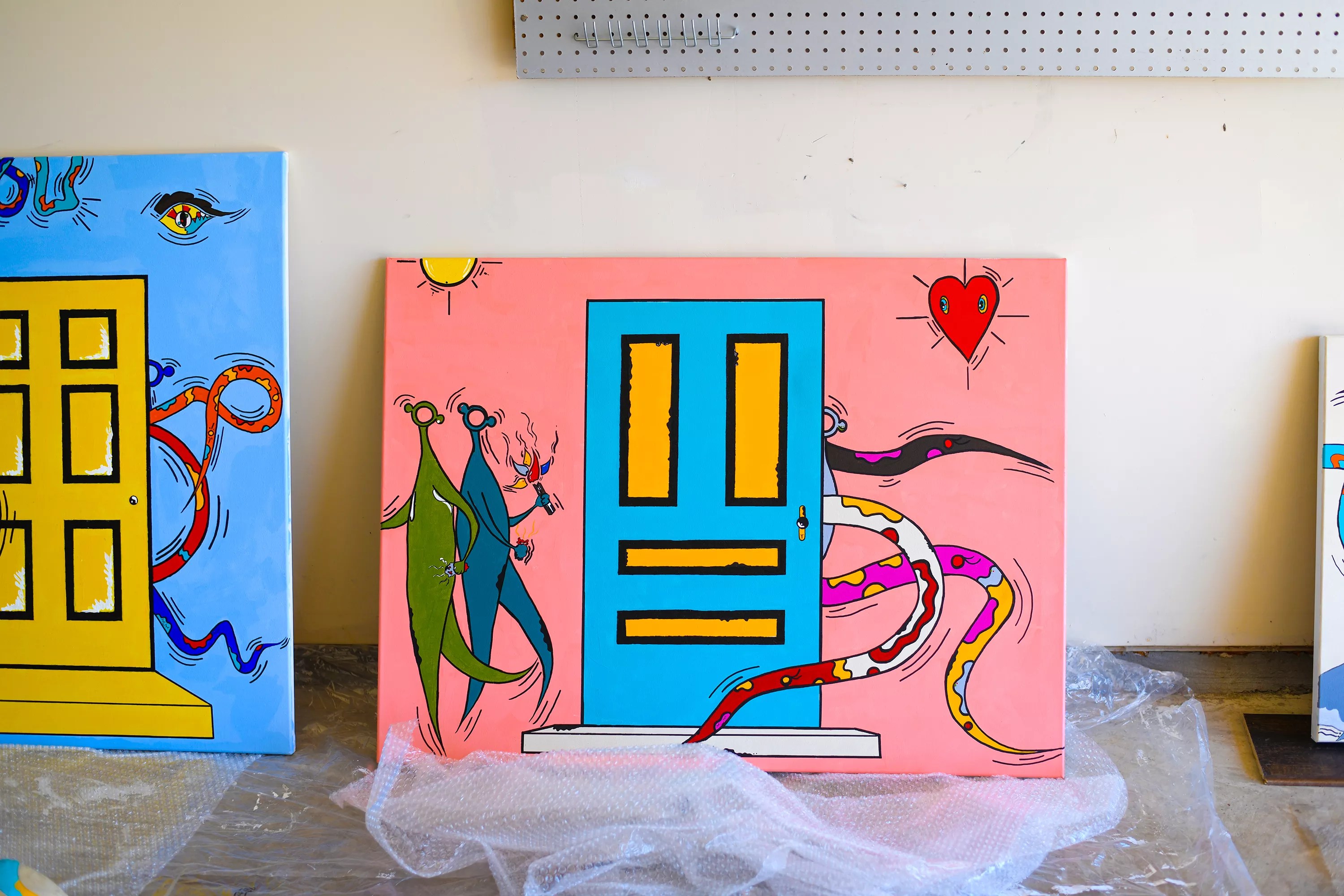 But the paintings are not just for him. Onifadé hopes his paintings – vibrant collisions of dark imagery and festive color – can show others how to survive even the most dire forms of despair.