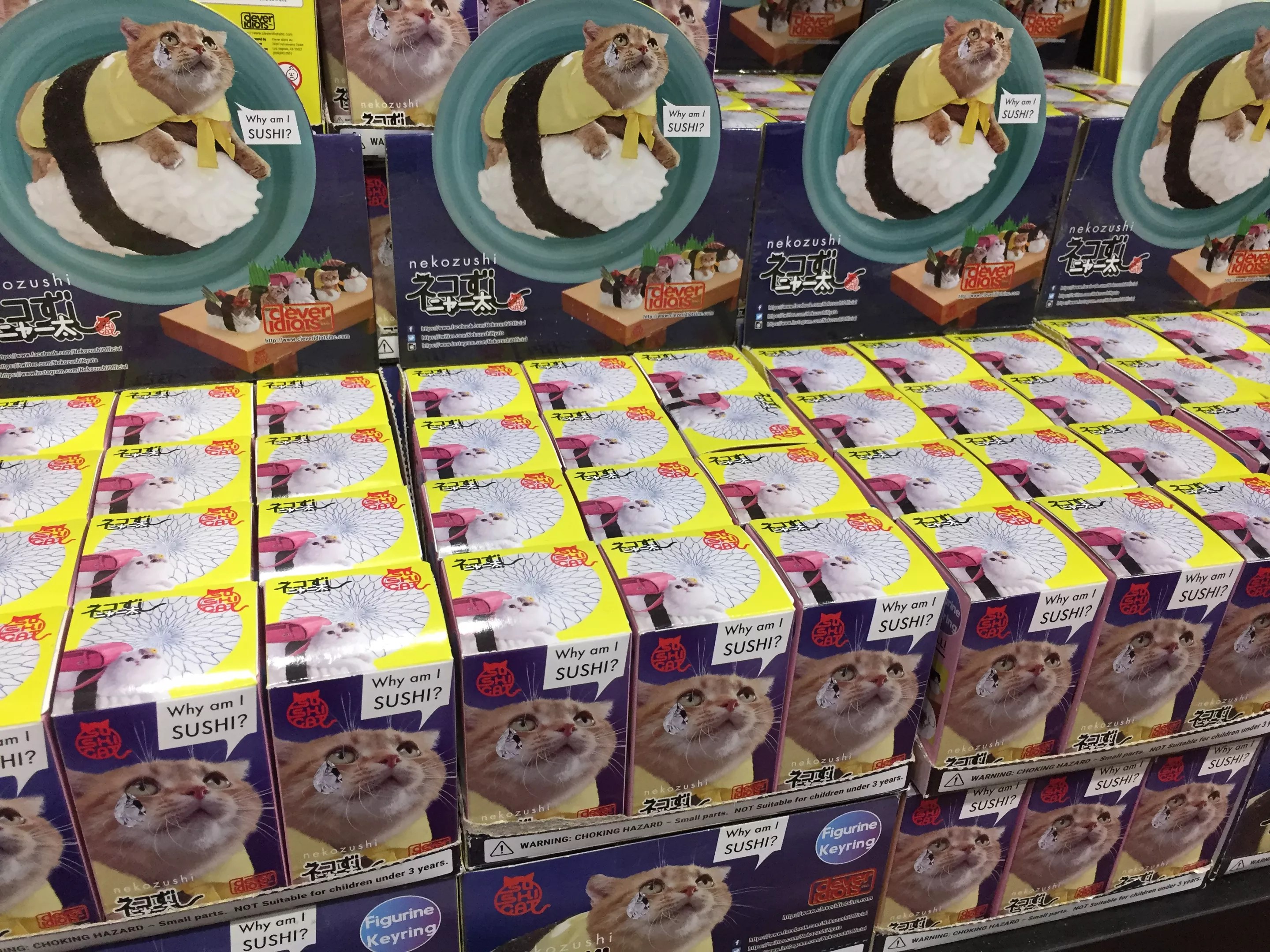 There’s a person-sized Pusheen and a ton of other Pusheen-related items, from stuffed danglers to books. There’s a line of Sushi Cat collectibles including slick file folders, coin purses, key chains and more. They have ceramic maneki neko (“lucky cats”) with a fortune you can pull out of the cat’s, um, butt? I need a translator for mine, but I still feel pretty lucky. There are cat cards; cat mugs; cat totes; Higuchi Yuki art and postcard books featuring his amazing cat drawings; 1-inch circle badges featuring cats in various attitudes – probably one that represents your cat. There’s so much more. It’s all there. Right meow. Yeah, I said it.