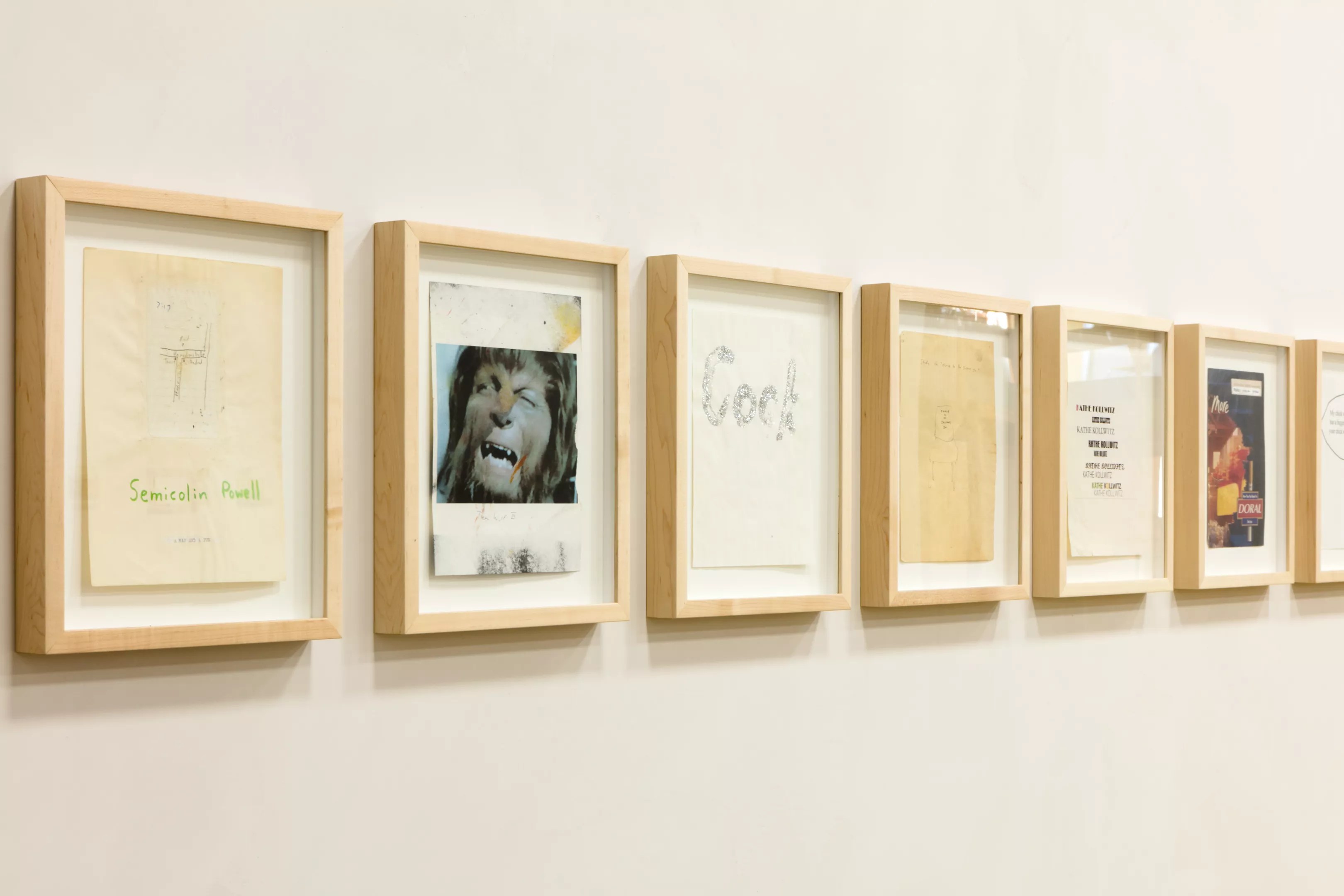 The show at The Box Company, however, is a little more focused than the 2014 retrospective. Although The Box Company space is massive, Schwarz’s work is hung only on the walls and placed on the floor of a small, white-boxed gallery set up in the middle of the warehouse. Inside the gallery, 24 of Schwarz’s drawings in identical frames hang at the same height. On the opposing wall, collage pieces composed of consumer product packaging hang alongside a series of eight rather banal photographs of people engaged in various generic activities: grocery shopping, at school, camping, etc., with the interruption of duct tape placed over individuals’ faces and the words “not for resale” scrawled haphazardly across each image in pen.