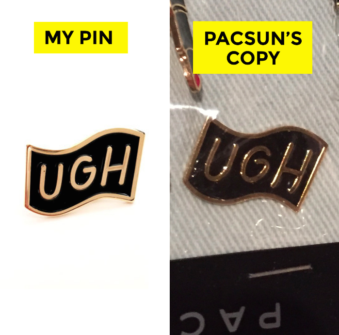 One of her Etsy customers sent her a picture of one of her pins that PacSun had imitated – a design with the word “UGH” in all capital letters. It matched Dauterman’s design exactly.