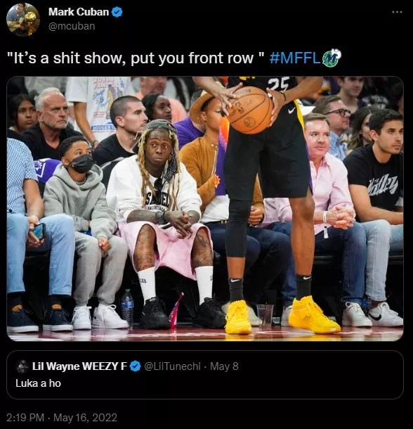 When the Mavs played the Phoenix Suns in the Western Conference semifinal (which Dallas won, by the way), Wayne, who is friends with Suns point guard Chris Paul, fired the first shot by calling Mavericks point guard Luka DonÄić “a ho” during the fourth game. Cuban responded with a picture of Lil Wayne sitting courtside under the caption, “It’s a shit show, put you front row,” a stinging reference from one of Wayne’s own songs, “Uproar.”