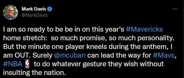 Davis remarked at the restart of the 2020 season that he was looking forward to the “Mavericks home stretch” but he also vowed to pull his support “the minute one player kneels during the anthem, I am OUT.”
