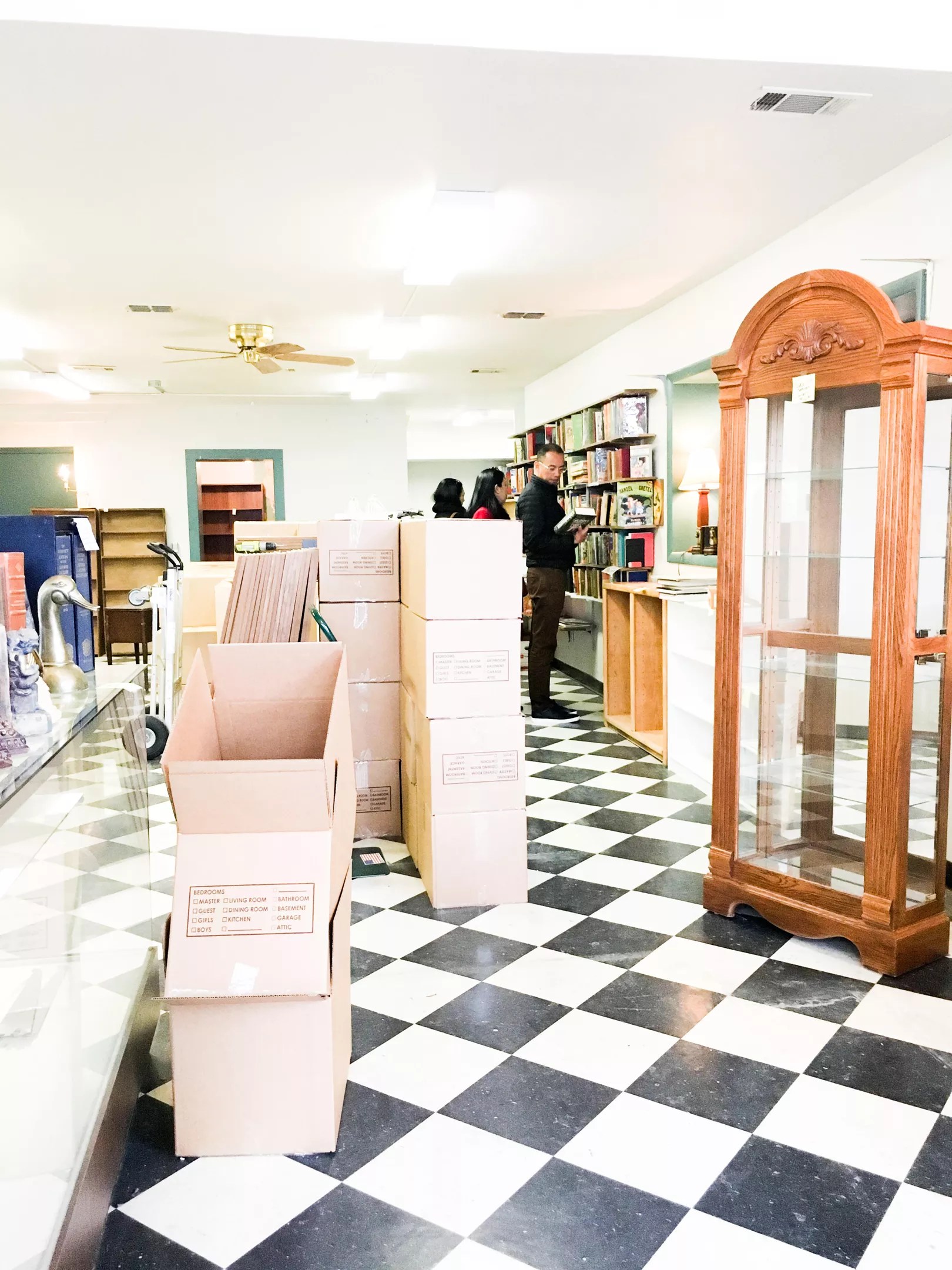 Tucked away on North Tennessee Street, the store was usually filled with antique first-edition books, its owner sitting at a desk, paper in hand, with a black schnauzer named Abby at his feet. But this Tuesday, it was filled with boxes piled high, and the shelves were being sold.