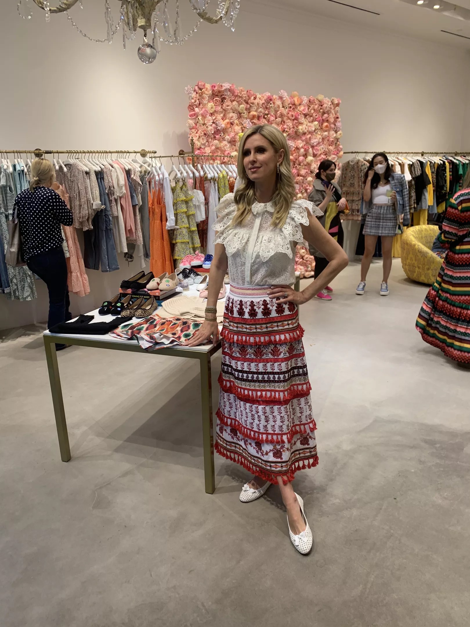 On Thursday, Hilton was wearing a long skirt, delicate white top, and some white ballet flats from her line, while the women inside Alice + Olivia were dressed in their typical Highland Park attire – designer heels paired with brightly colored dresses.