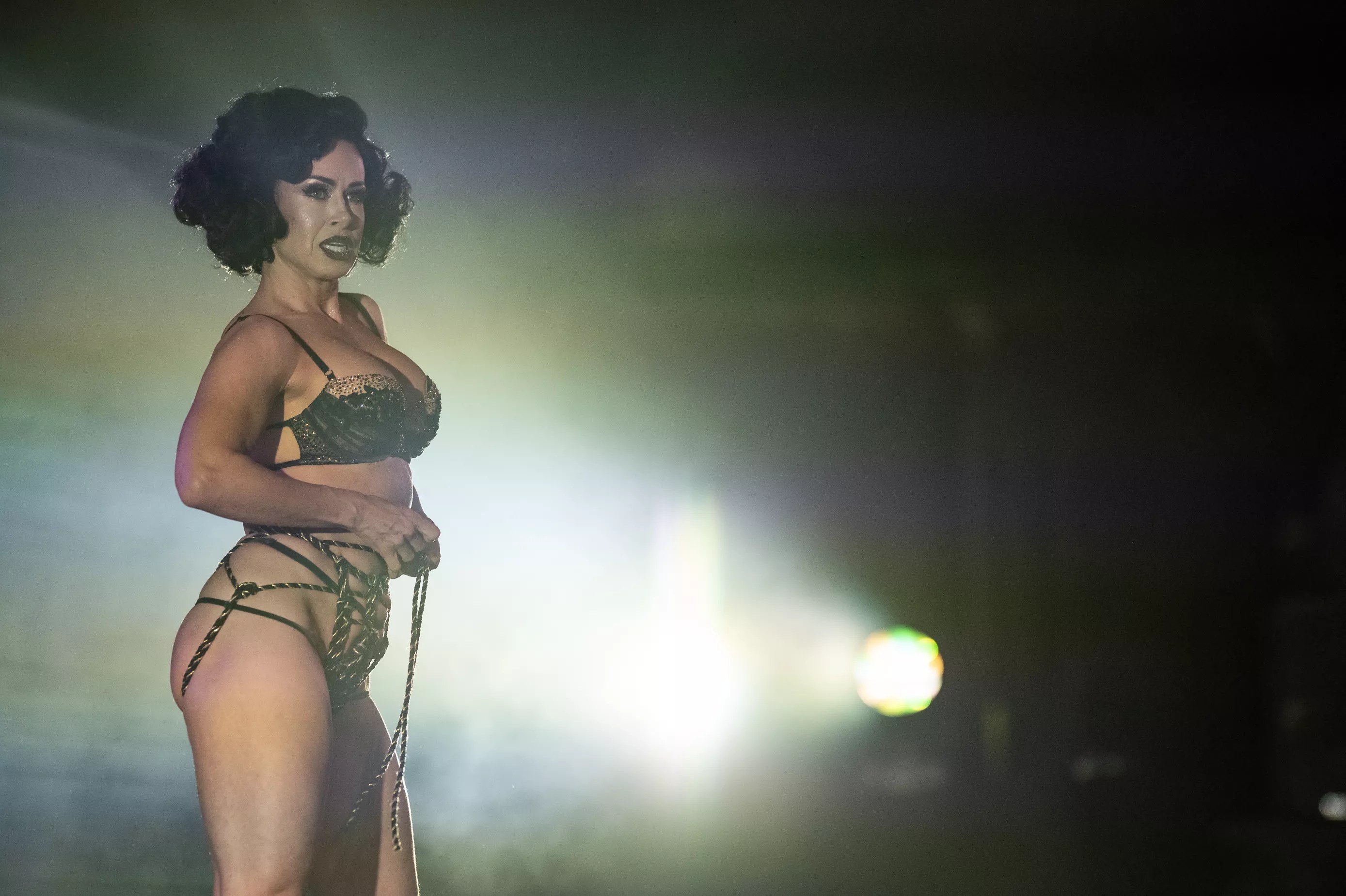 Courtney Crave is suspended on the stage.