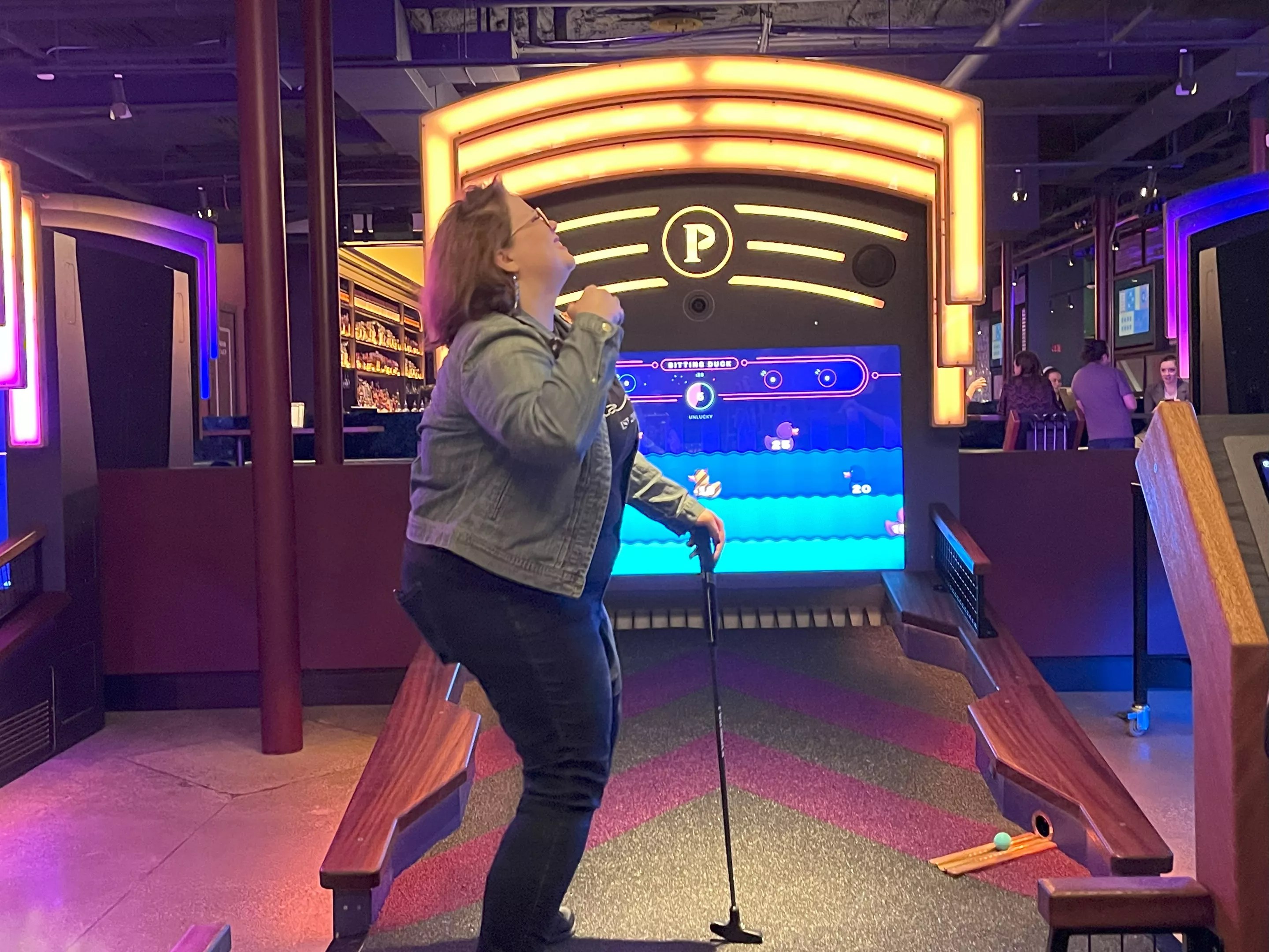 Kas Bradley hits the jackpot on a Challenge Hole pod, a new feature at the Puttshack mini-golf complex in Addison.