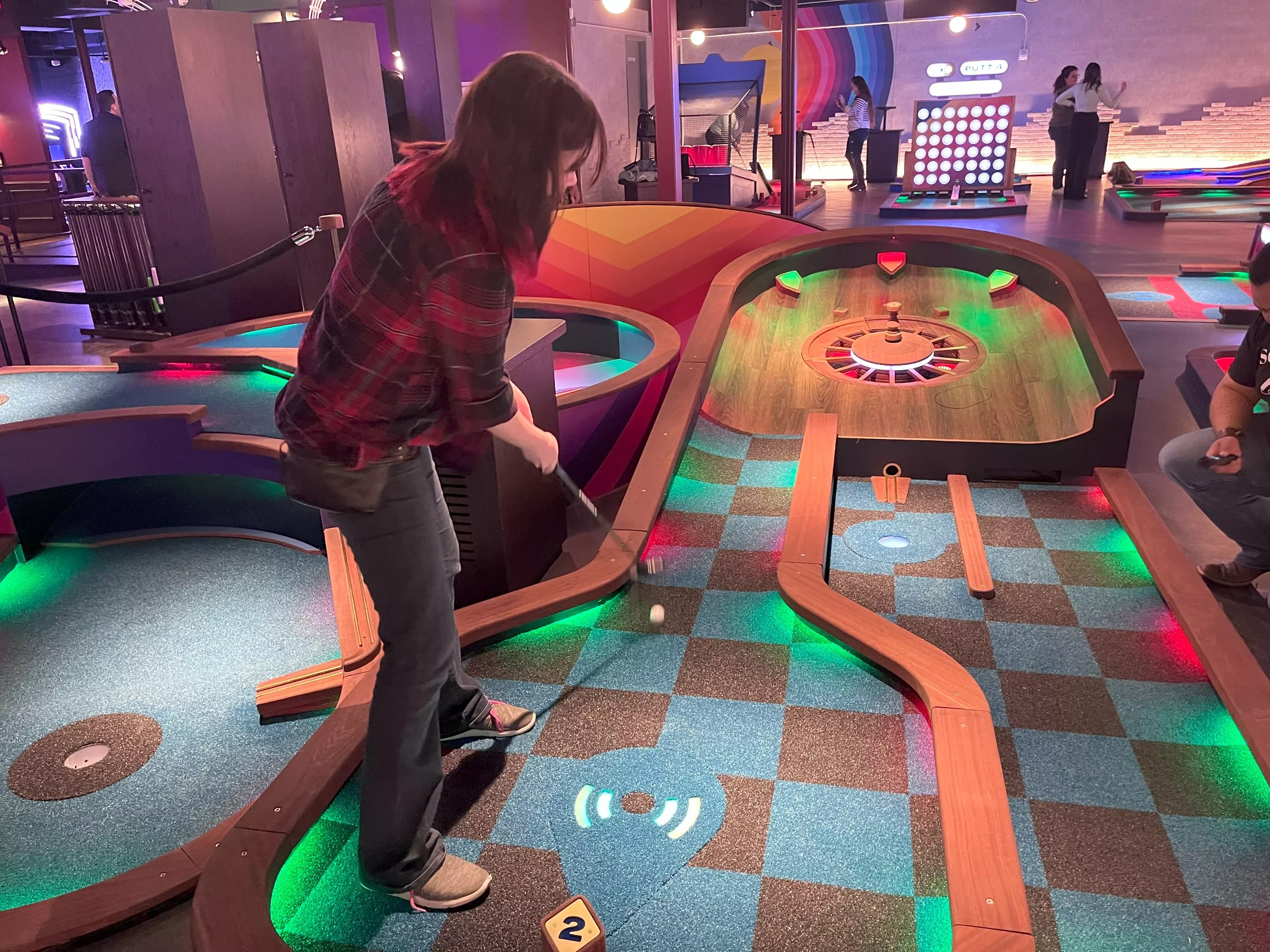 Cora Barton takes a spin on the roulette wheel hole at Puttshack in Addison.