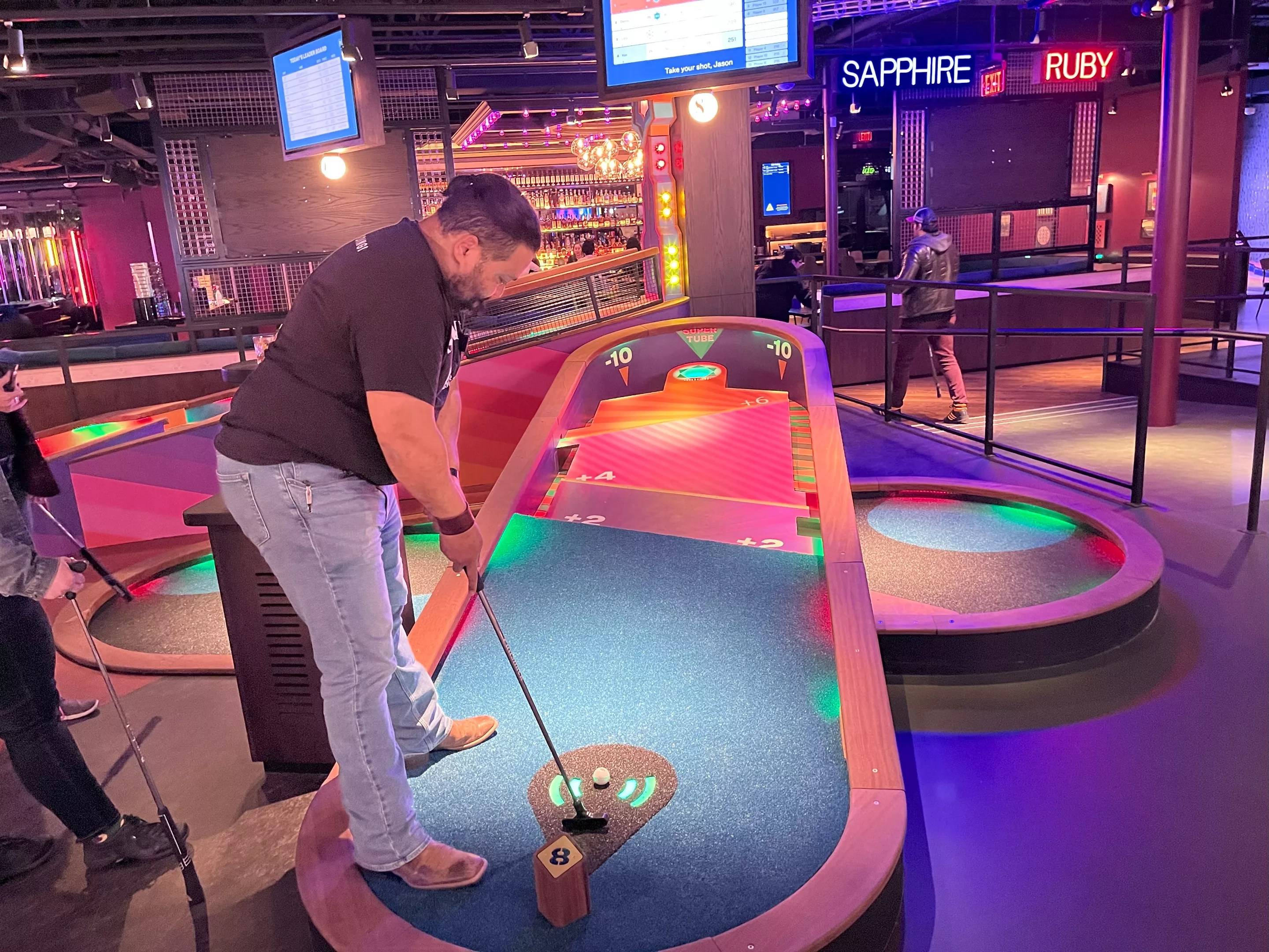 The Puttshack experience plays just like the putt-putt golf course that every child of the ’80s went to on a friend’s birthday except for two notable differences: the goal changes from hole to hole and the scoring is completely different.