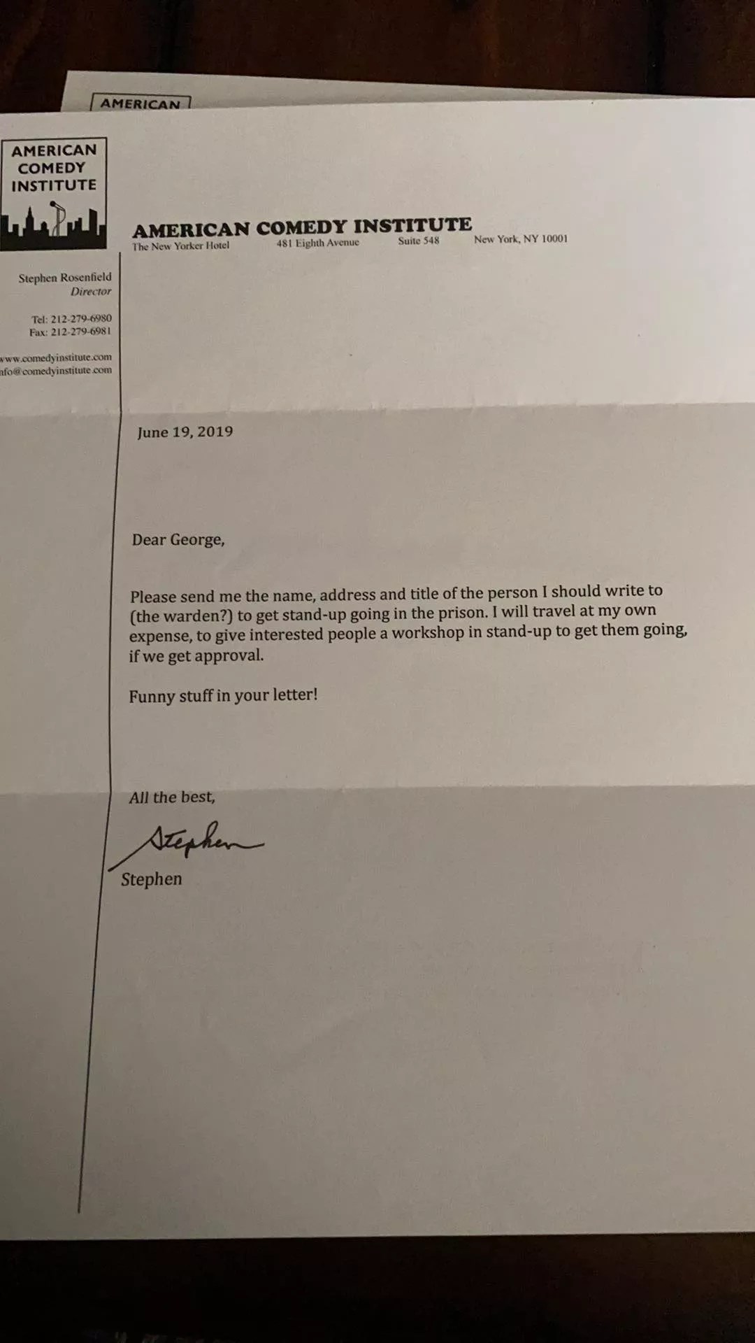 Comedy producer and teacher Stephen Rosenfeld sent a personal letter to George Rojas while he was in prison offering to help him stage shows for his fellow inmates.
