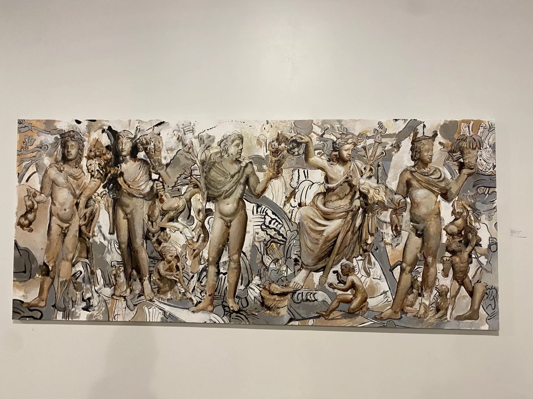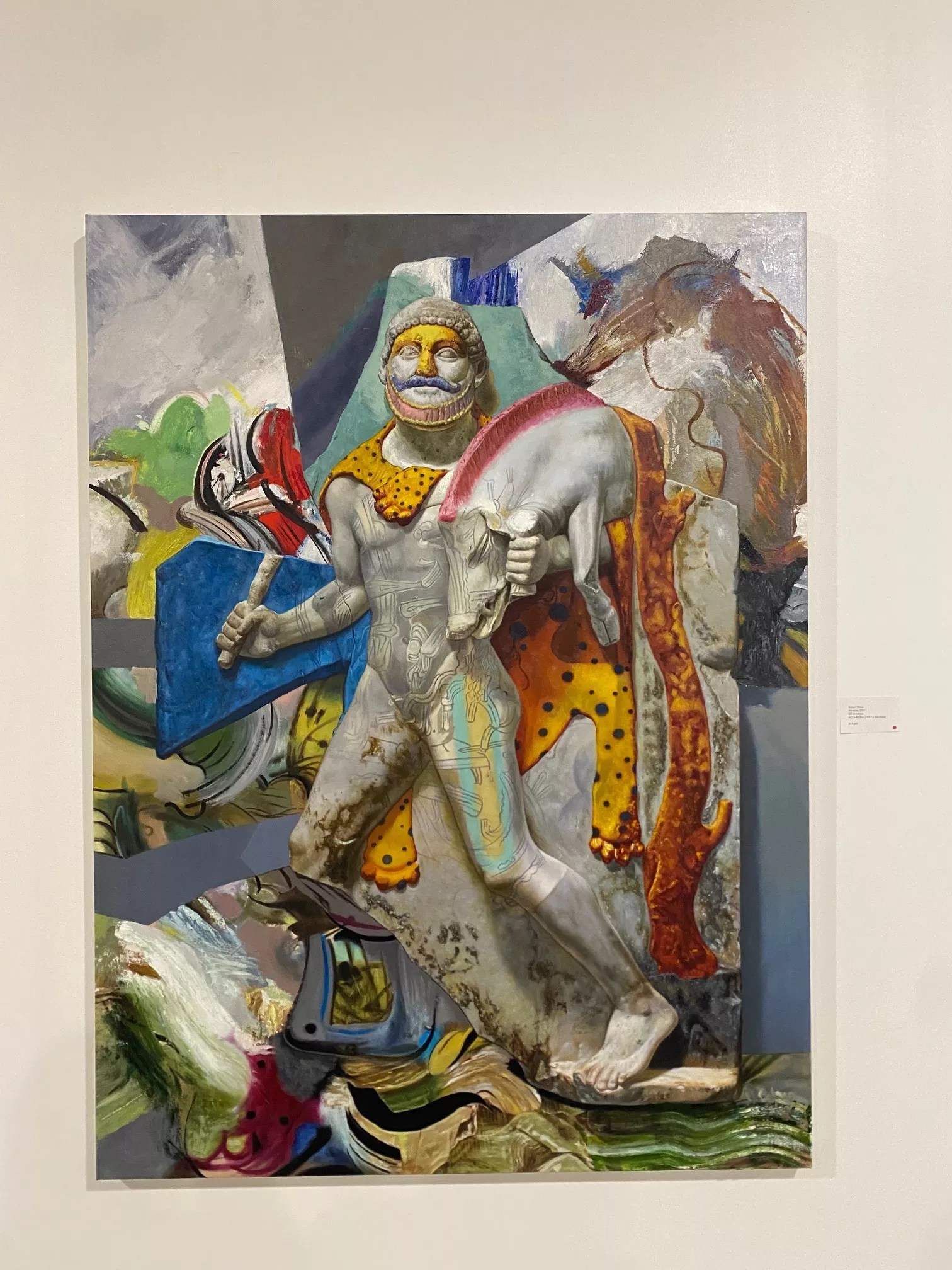 A closer look at each piece reveals this tactic: Greek statues that stick out and immediately draw the eye are sometimes textured with tribal and graffiti-like designs – decorative floral motifs and uncanny shapes and colors explode around them, hints of surrealism and abstract expressionism mingled throughout.