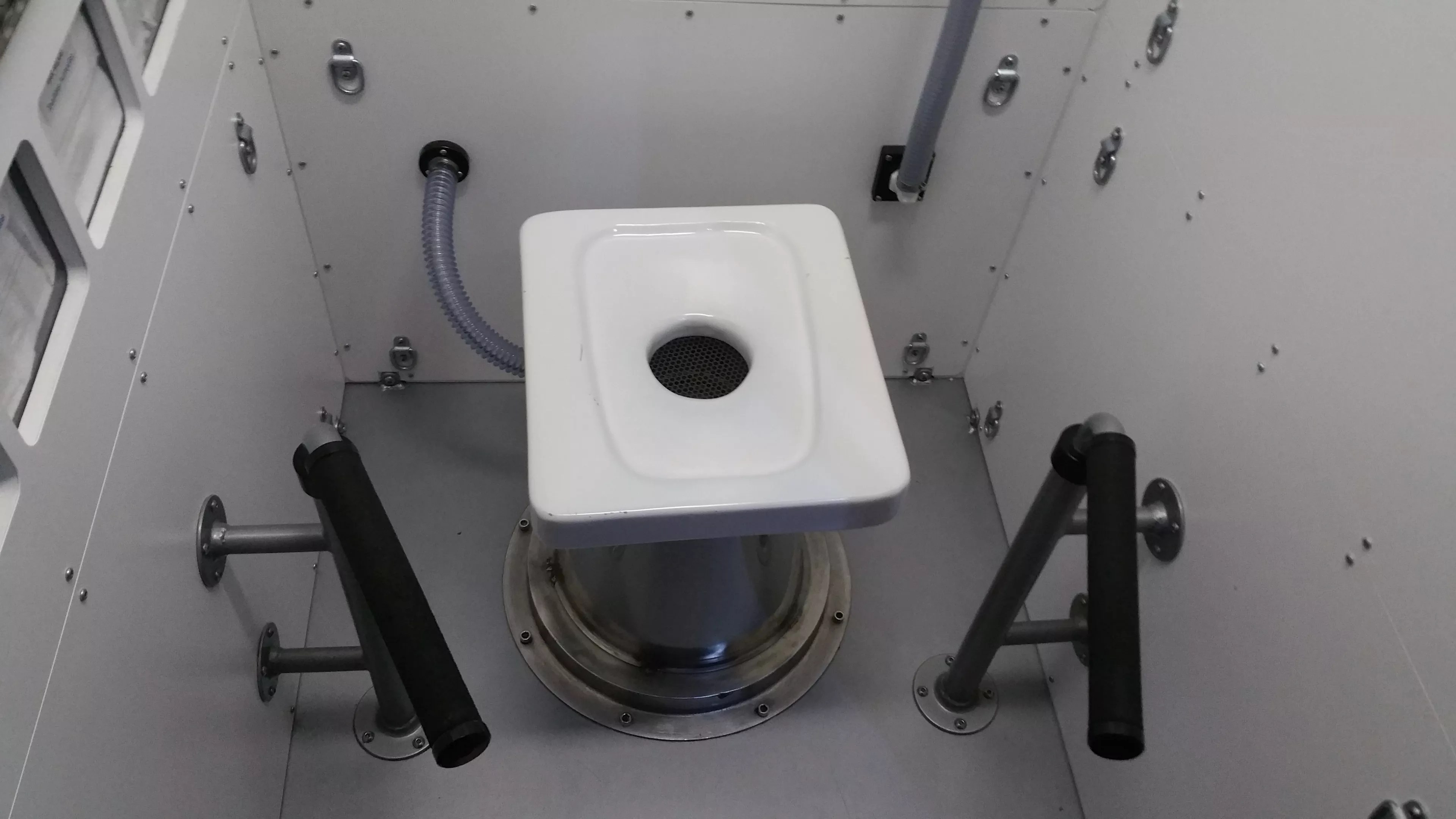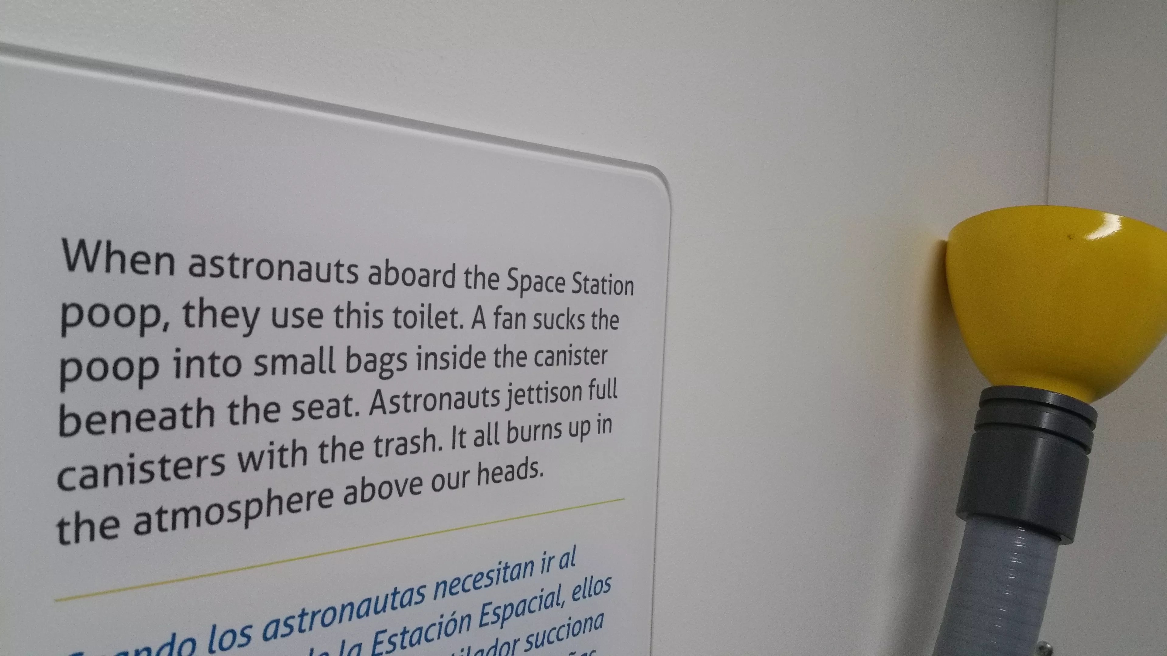 Here is the crapper in question, modeled after the one on the International Space Station. Museum visitors are encouraged to sit on it. The black handles rotate over the user’s thighs to help astronauts stay in place while they go to the bathroom, rather than floating away during the process and making an unholy, zero-G mess.