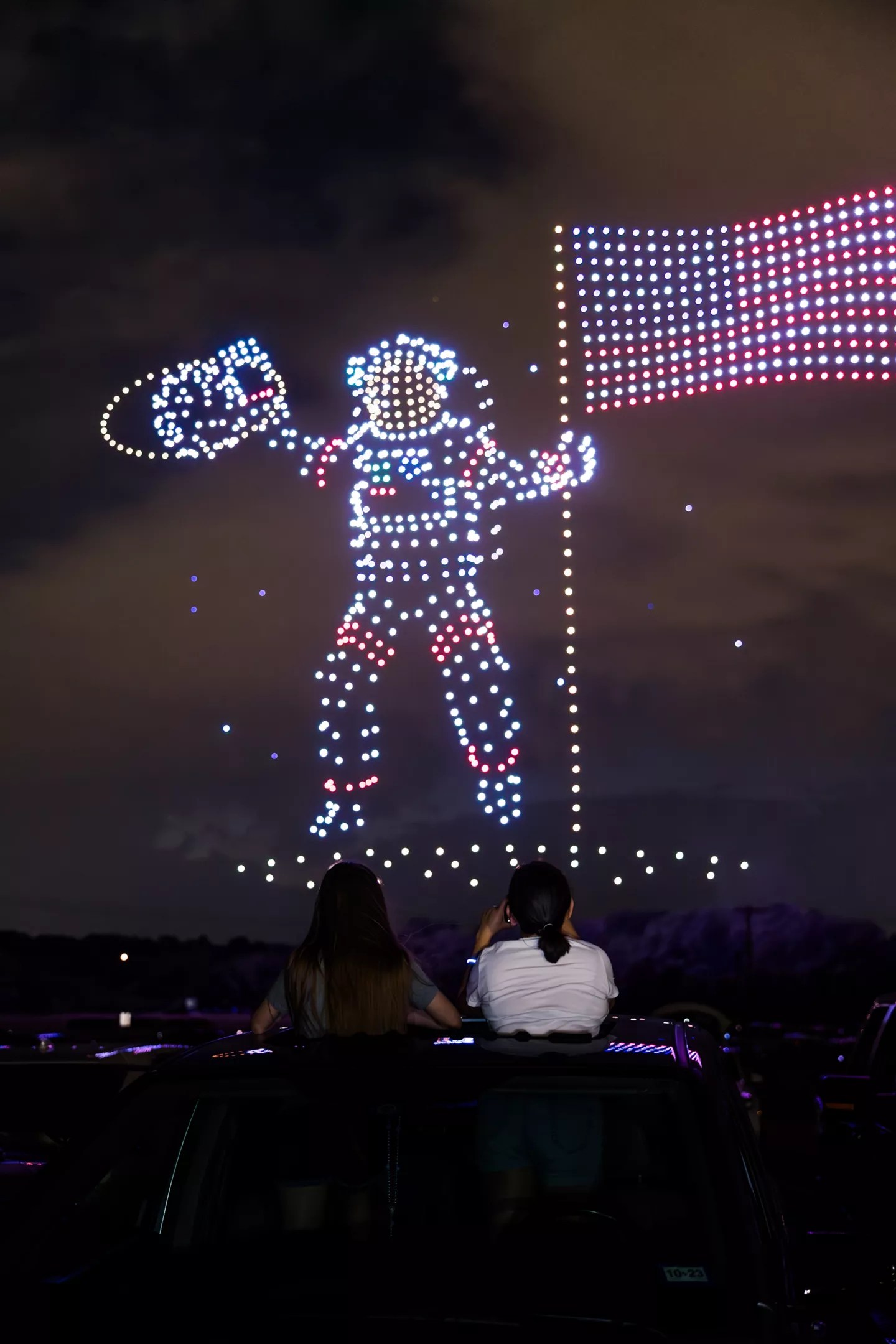 An astronaut planting an American flag on the moon is one of the images created by Sky Elements Drone Shows for North Richland Hills’ Independence Day celebration on Monday night.