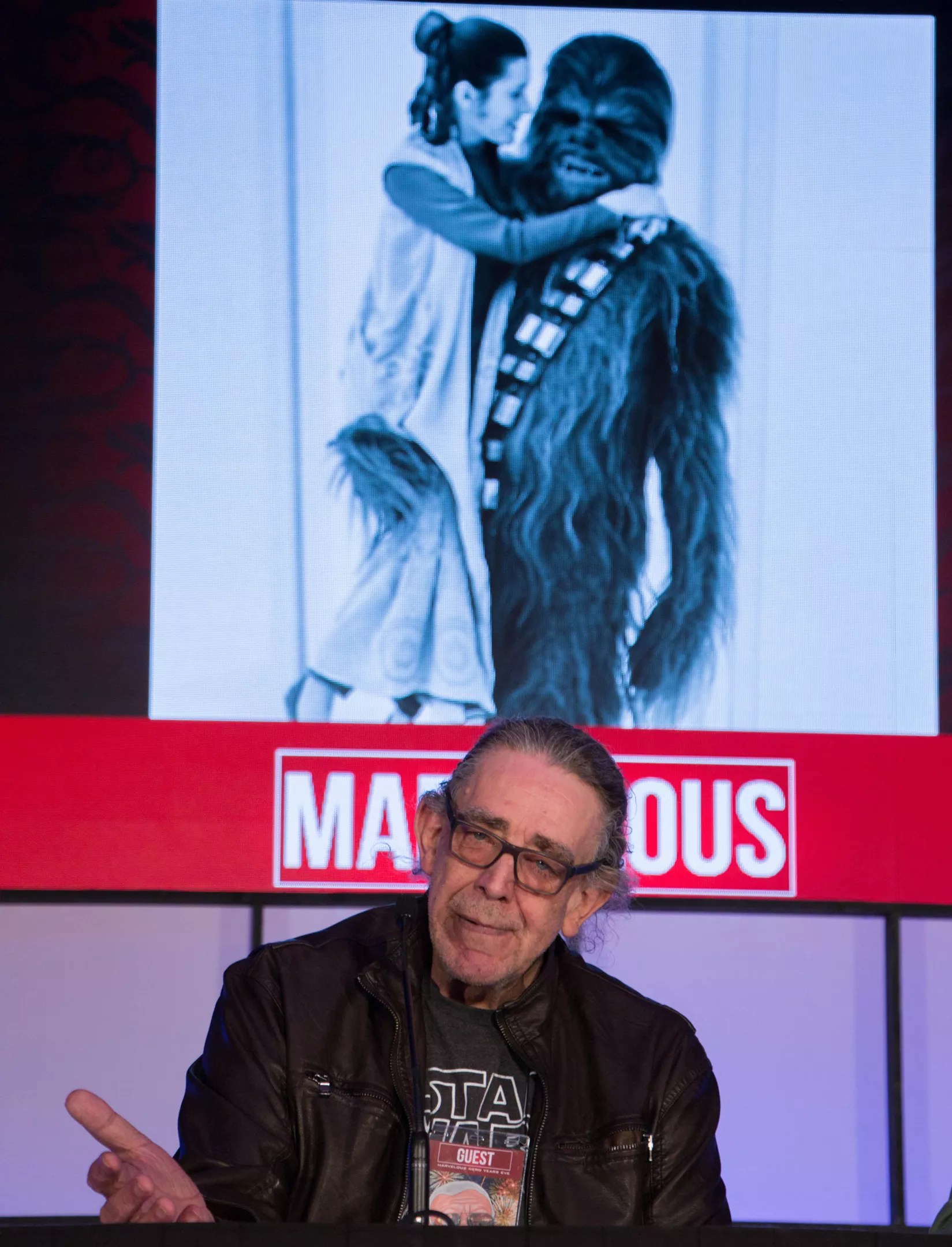 Actor Peter Mayhew offered a tribute to actress Carrie Fisher at the Marvelous Nerd Year's Eve convention in 2016 in Dallas.