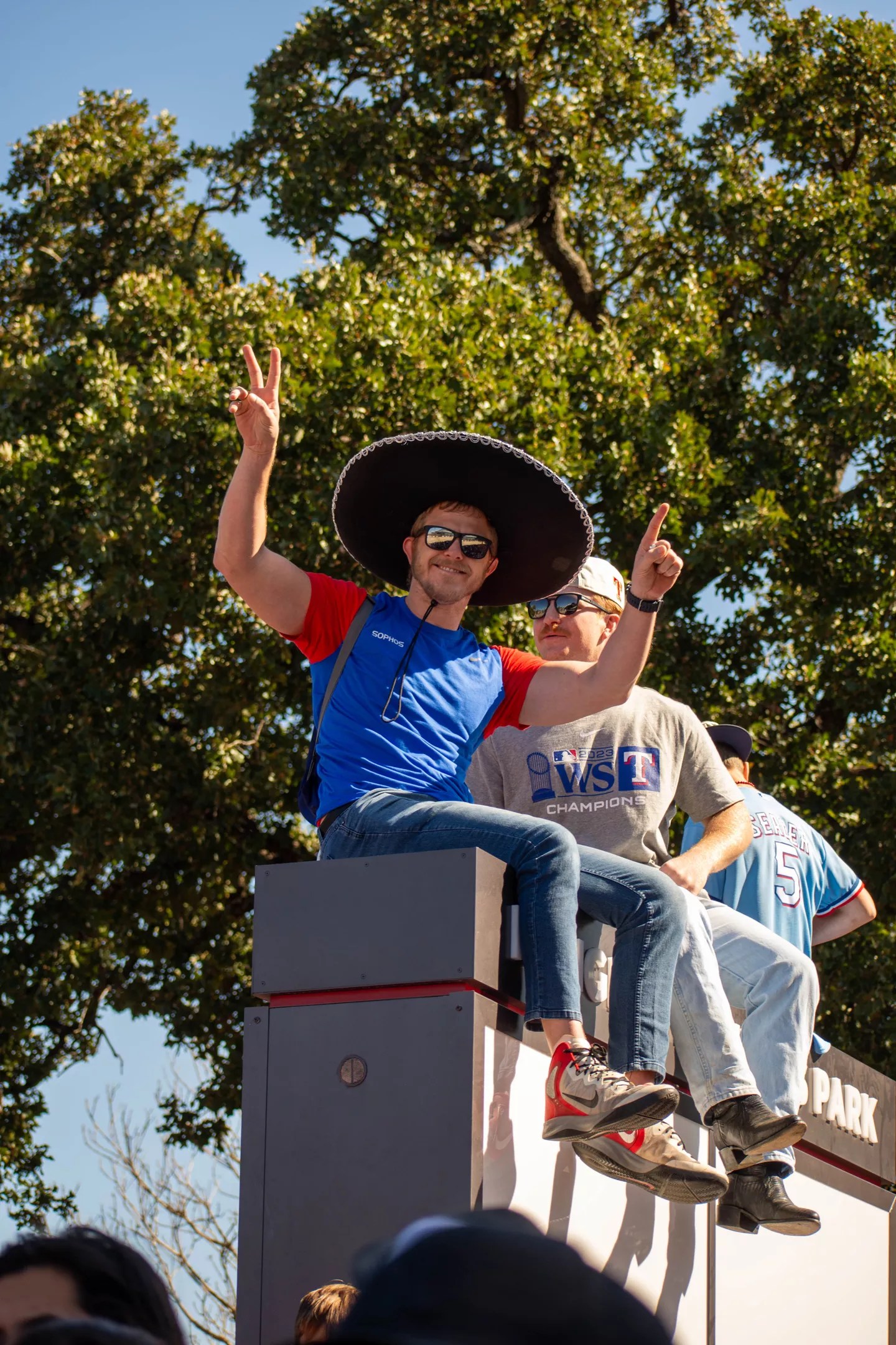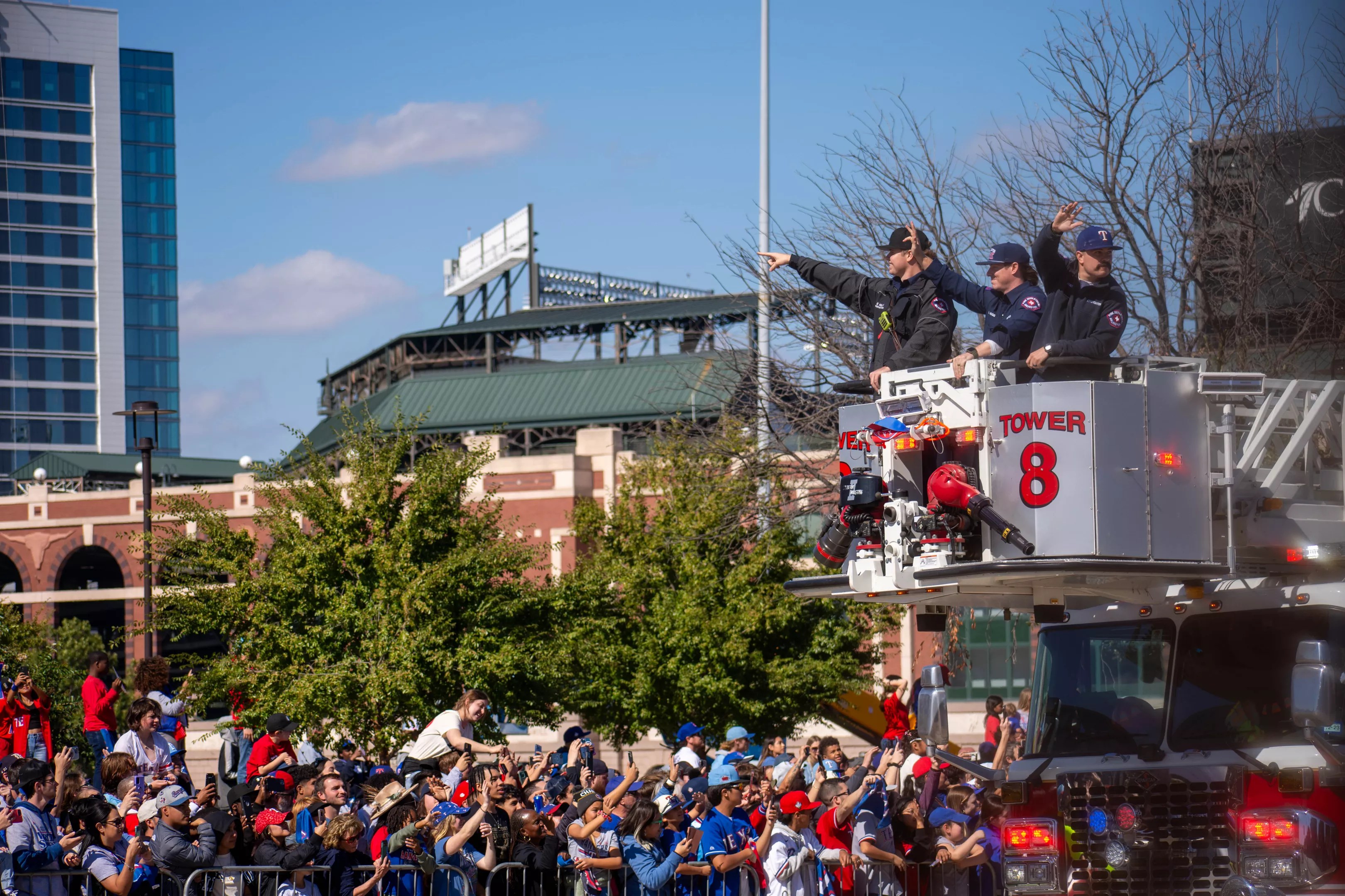 To celebrate of the Texas Rangers’ World Series victory on Wednesday, the city of Arlington threw a parade for fans on Friday. Schools closed, and hundreds of thousands of fans gathered in the streets to celebrate the team’s first-ever World Series title. The parade featured appearances by the Rangers themselves as well as various Arlington dignitaries and local high-school marching bands and cheerleaders.
