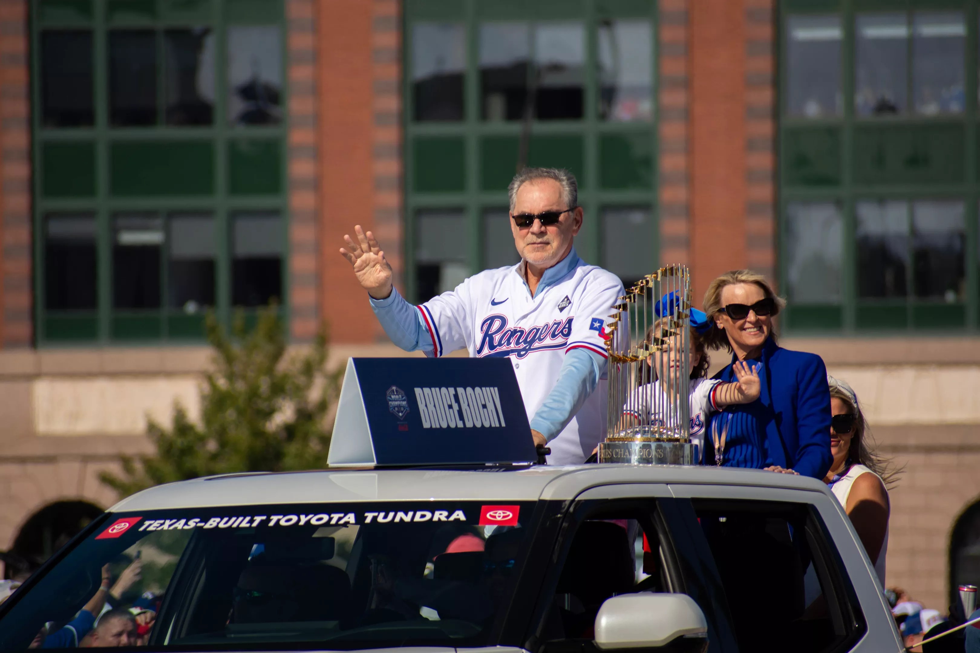 Texas Rangers manager Bruce Bochy takes the World Series trophy for a ride.