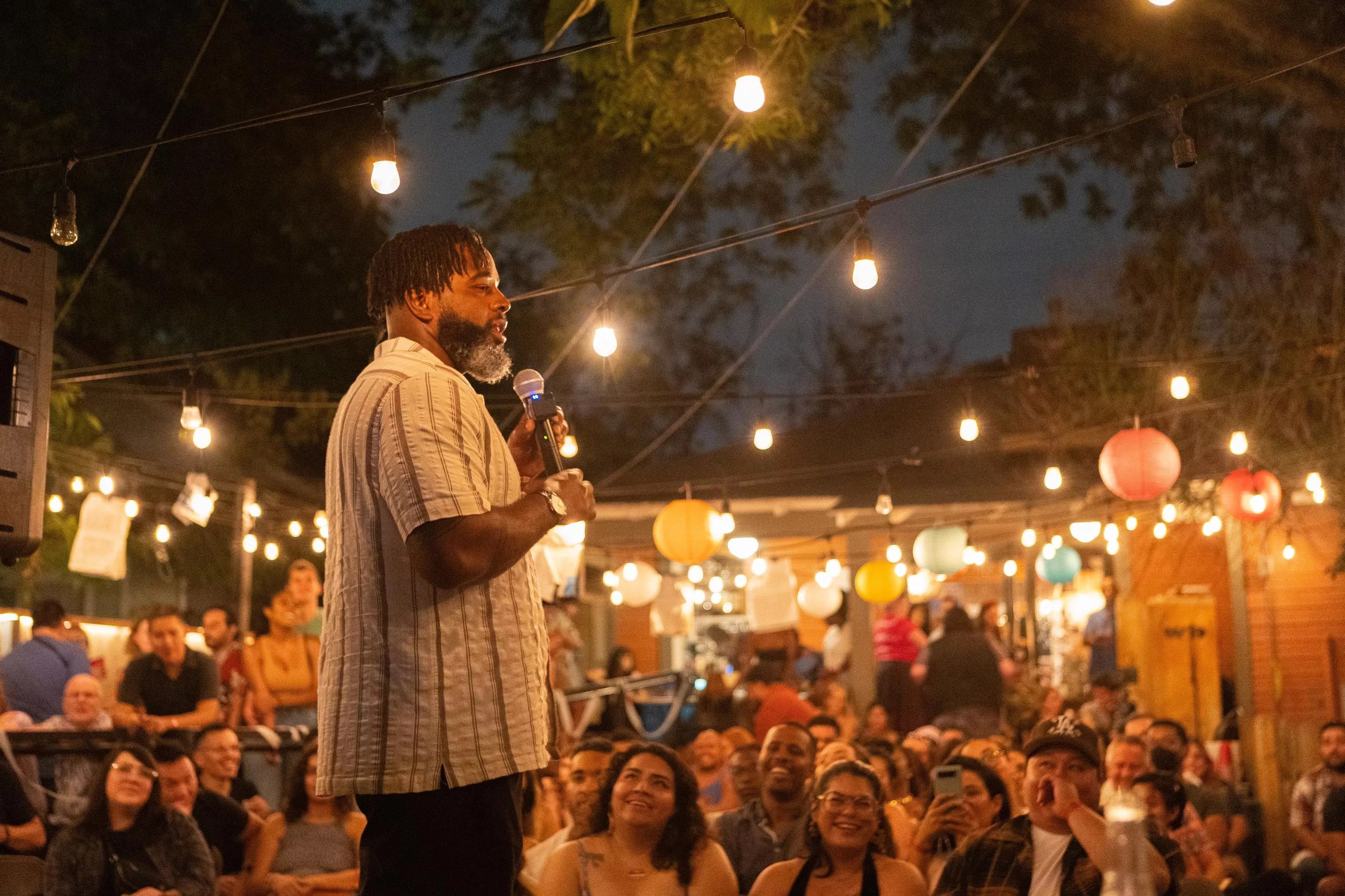 Cameron Barnes tells a tale at The Wild Detectives on W. Eighth Street in the Talking Dirty After Dark storytelling series.