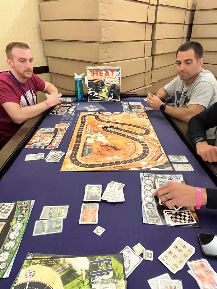 Heat: Pedal to the Metal is all about getting your 1920s F1 race car around one of four tracks for a certain number of laps and being first across the finish line on the final one. Each racer draws cards from a deck to determine how focused and fast they are moving, which can be thrown wildly out of balance with “stress” cards that can cause the vehicle to speed or slow down depending on the card that comes after it. Then there are “heat” cards that act as a kind of currency to help you take a bigger edge on your opponents and can cause problems down the line if you spend them too close to the green flag.