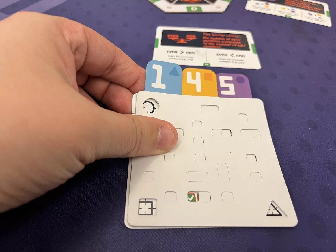 The goal is to guess a series of three numbers from 1 to 5 using special punch cards like the kind you’d see in one of those old-timey computers that would take up entire rooms. You guess by taking the special punch cards with your numbers and its place in the sequence, lining them up together and setting them against a grid of Xs and checks that correspond with a condition card revealing the secret sequence. The condition may consist of a series of many of a certain number, how many odd or even numbers or the greater than/less than value of certain numbers in the secret, three-digit number. The creators have somehow organized these grids so the punch cards match up with these conditions to reveal the correct or incorrect guesses and conditions using advanced calculus or algebra that would literally kill me. It just makes the whole game exciting and gripping, especially when you can figure out ways to eliminate or deduce the answer before your opponents.