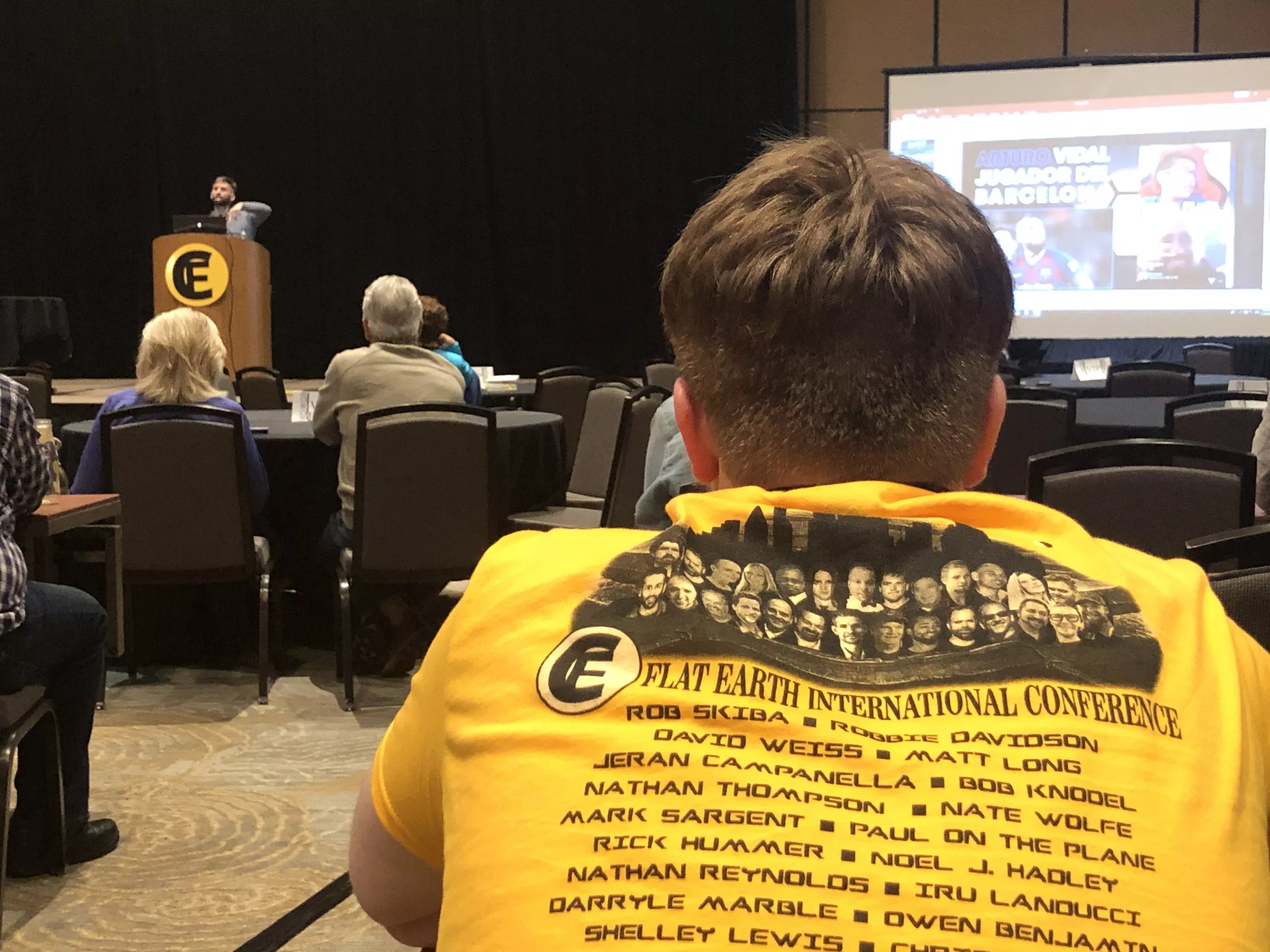 This is just one of the many banners on display at the Flat Earth International Conference “proving” that the Earth is flat.