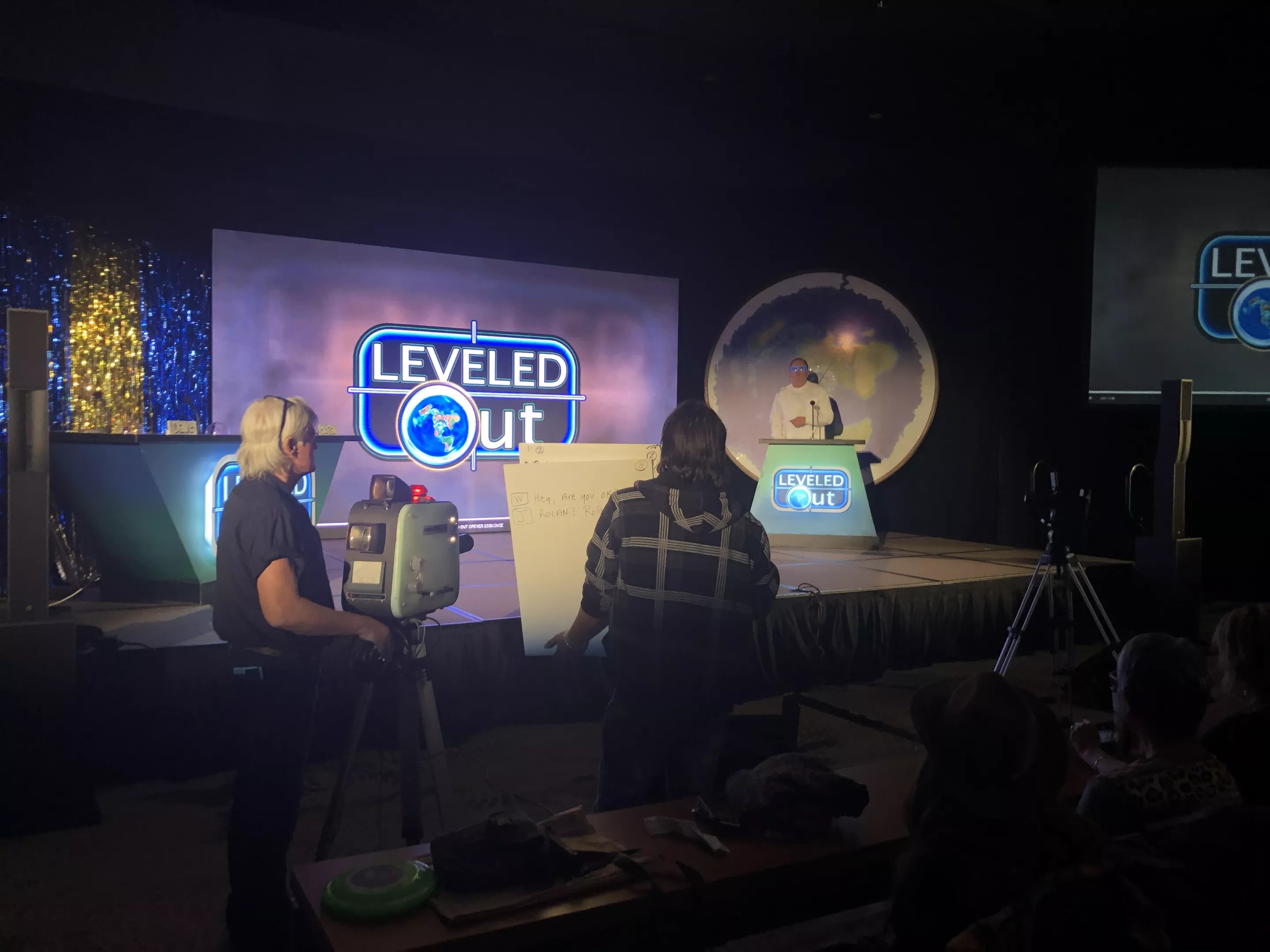 Flat Earth celebrity Mark Sargent (top right) hosts a fictional game show in a scene for a feature-length movie being made about flat Earth belief at the Flat Earth International Conference held at the Frisco Hotel and Convention Center.