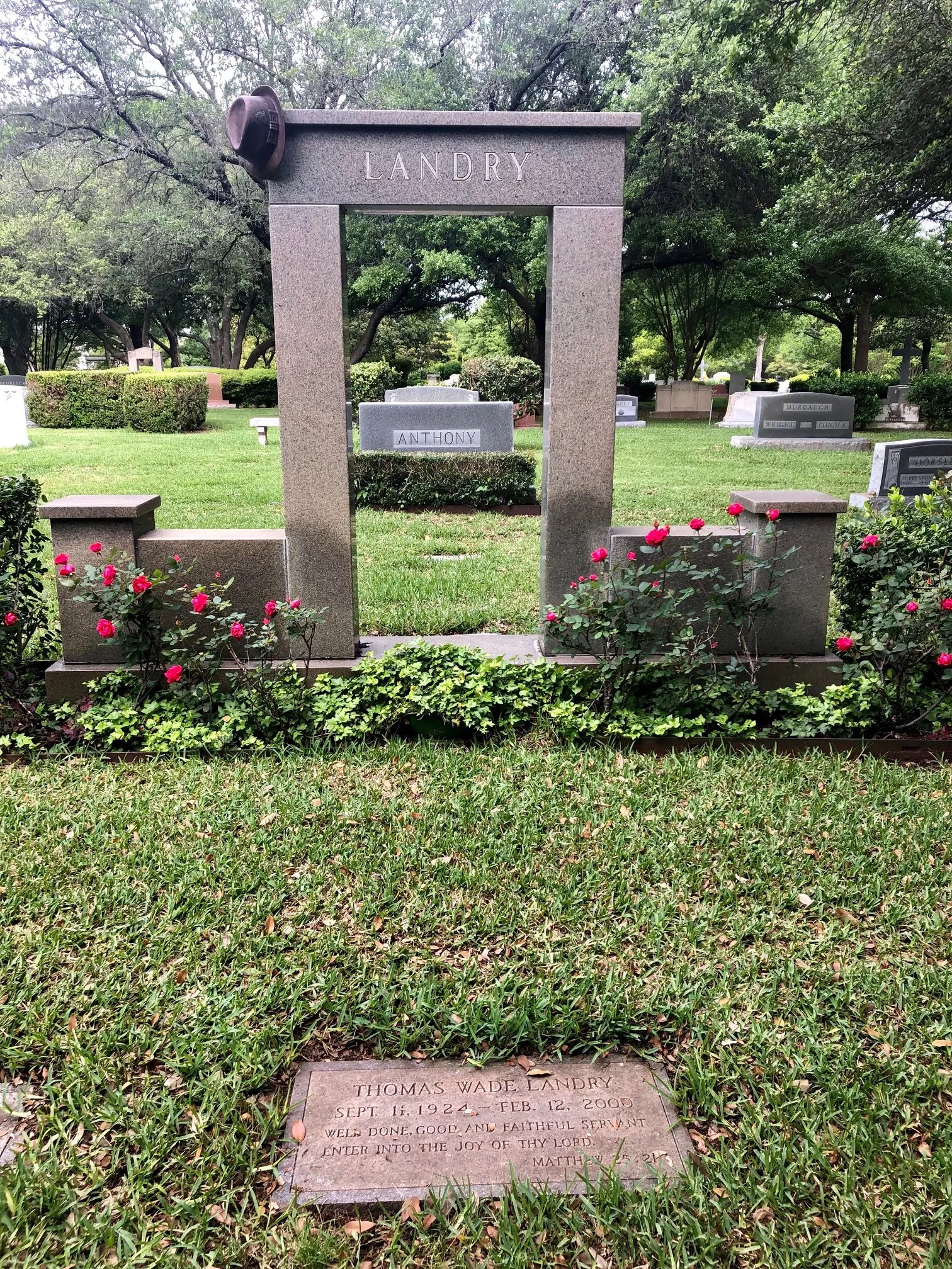 Landry was laid to rest on the east end of the cemetery near NorthPark Center under a monument marked “Landry.” A sculpted fedora hangs from one of its corners.