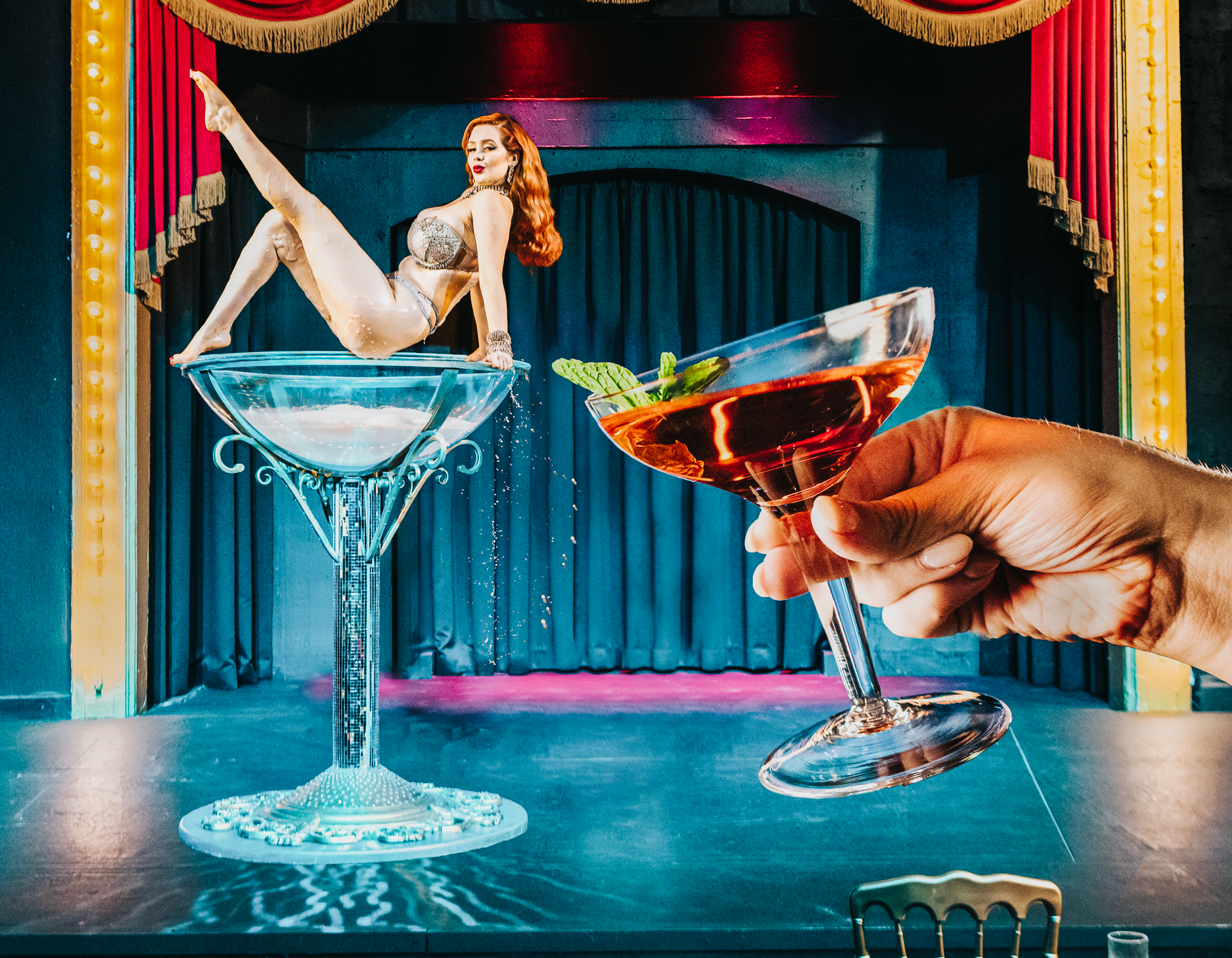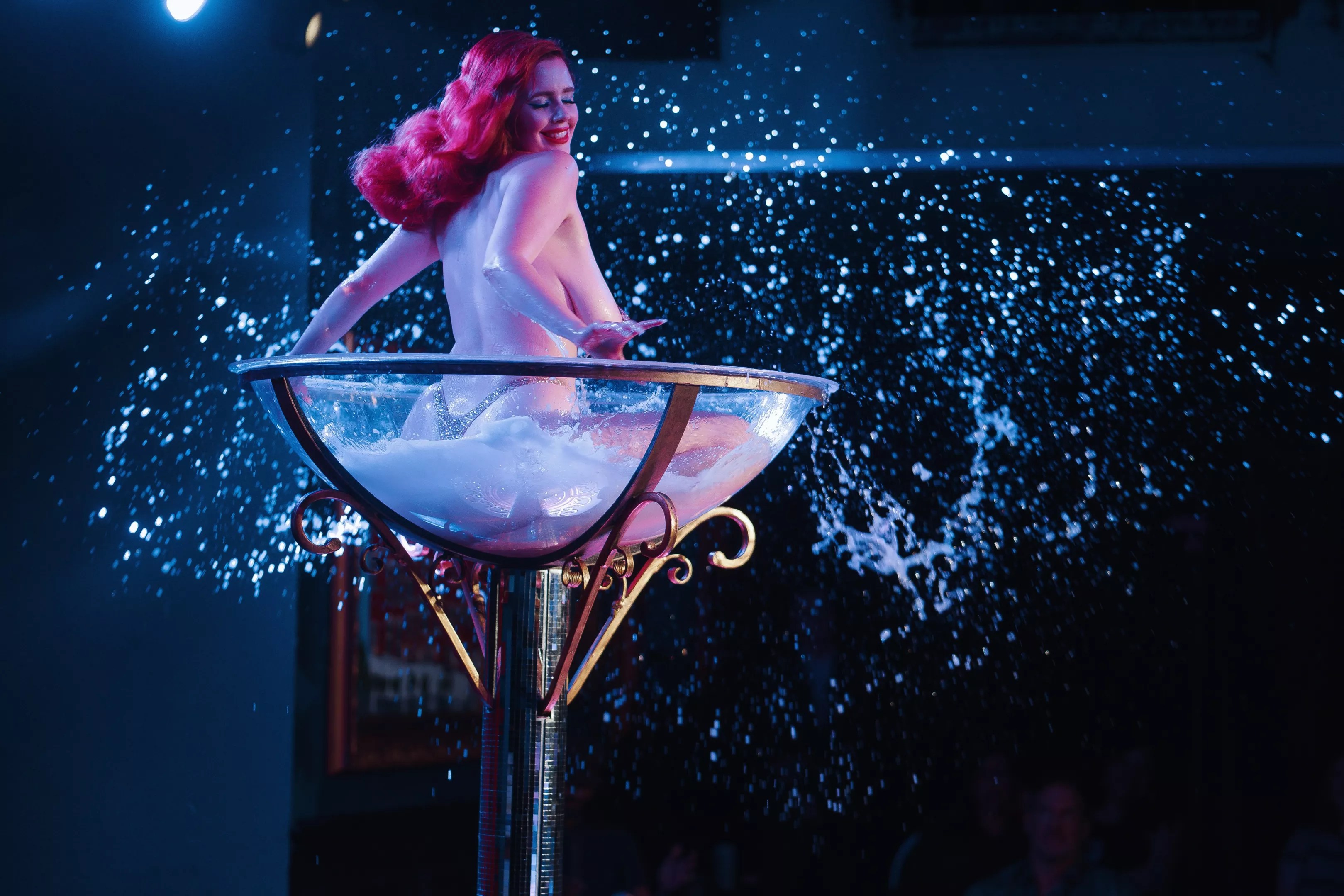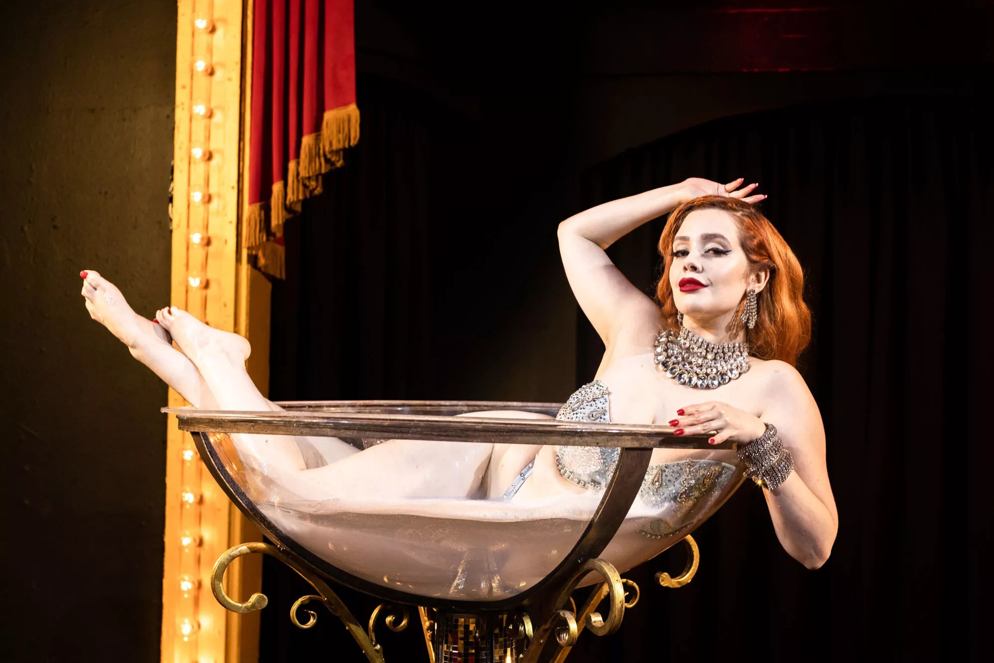 Headliner Minxie Mimieux is the mastermind behind this timeless fantasy. She closes the show by climbing into a giant Champagne coupe, though the prop is hardly noticeable when it’s next to her bouncing presence.