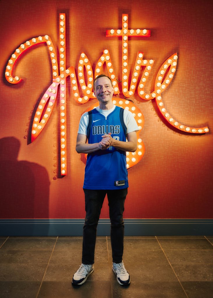We first notice Chad Cline, a middle-aged man dressed in a full Mavericks uniform adorned with Doncic’s no. 77. If you’re four drinks in and squinting from a distance, perhaps his tattoos, messy haircut and goofy cadence would pass as Doncic himself. For some, taking the emotionally charged part of Doncic would be a challenge. But for Cline, a career actor who made his stage debut in another sports satire, Damn Yankees, it’s just another day at the office.