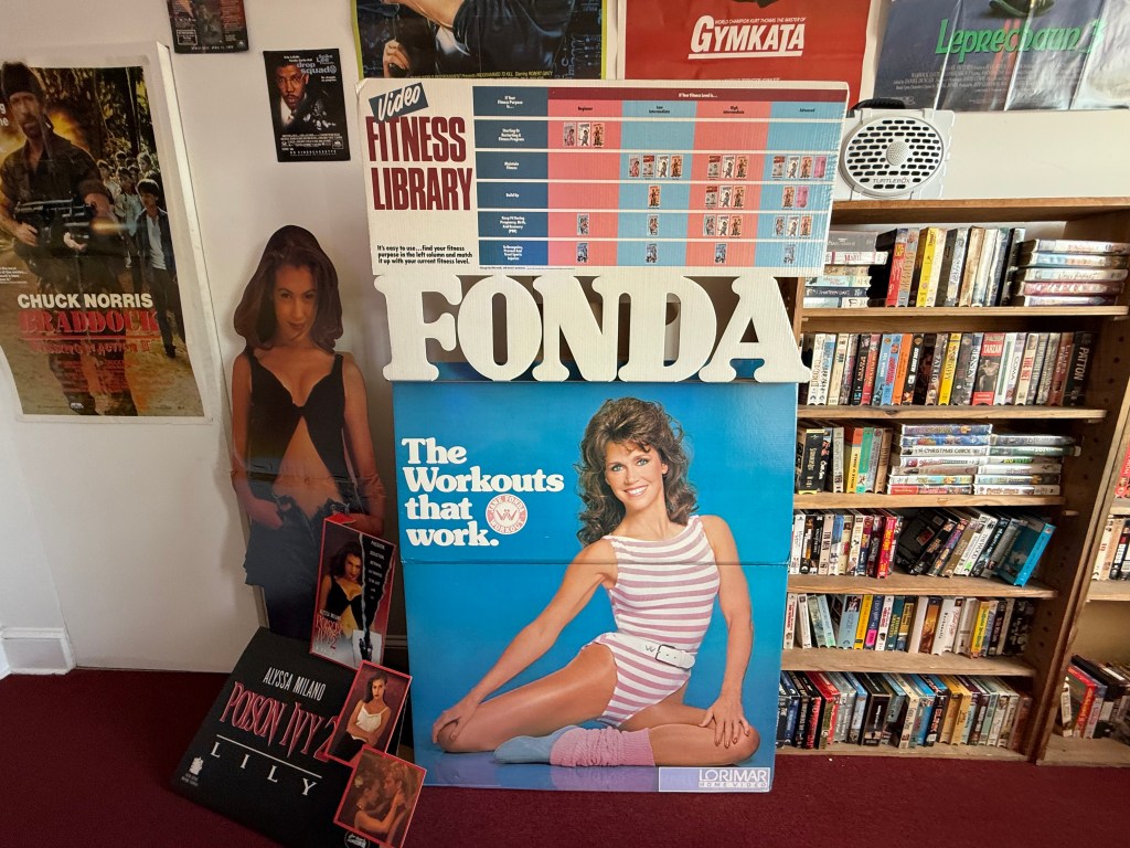 In addition to the tapes on the shelves, the video store aesthetic of the Video Crypt is completed with classic movie posters on the walls and standees from the era advertising then-new releases like Jackie Brown, The Hunt for Red October, and Jane Fonda’s workout series (ranging in difficulty from beginner, low-Intermediate, high-intermediate and Advanced, for the true jazzercise aficionado). These are also pulled from the curators’ personal collections.