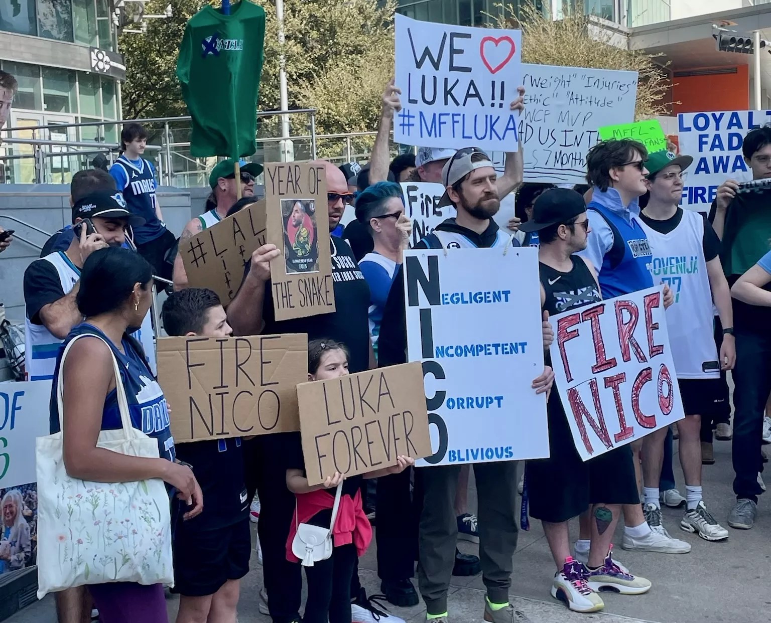 Fans gathered in Victory Plaza mad about the recent Luka Doncic trade.