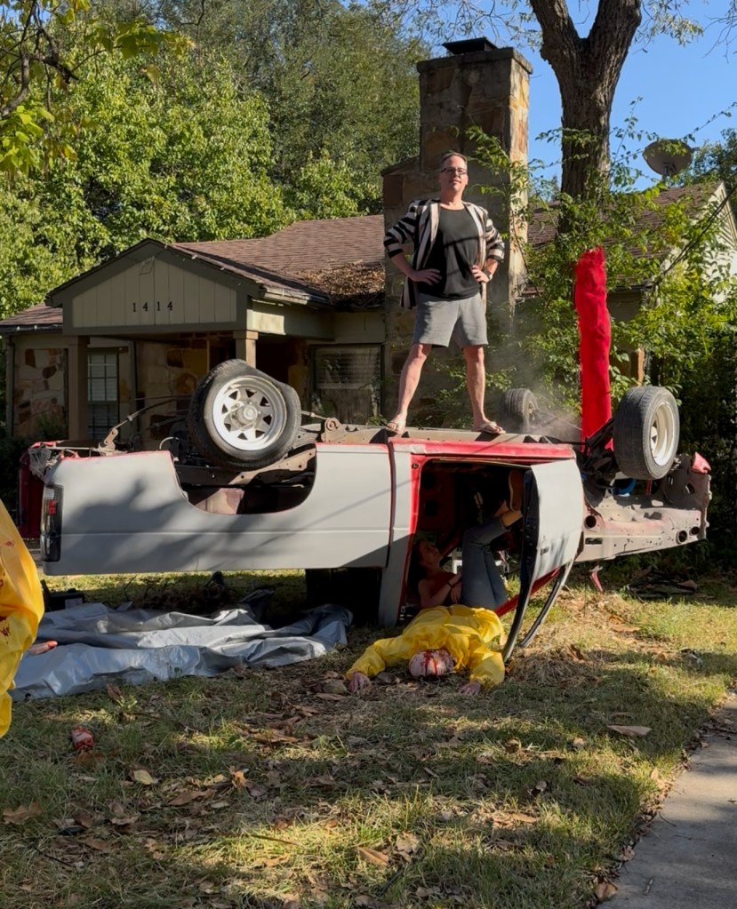 Rose Cobey, the partner in question, is also a little queasy about blood, so Novak has pivoted further in recent years to more conceptual stories, using self-built animatronics and props. In this case, the crashed helicopter transformed into an upside-down truck, and he wrote a back story about zombies to support it. One video previewing this year’s setup already has more than a million views.