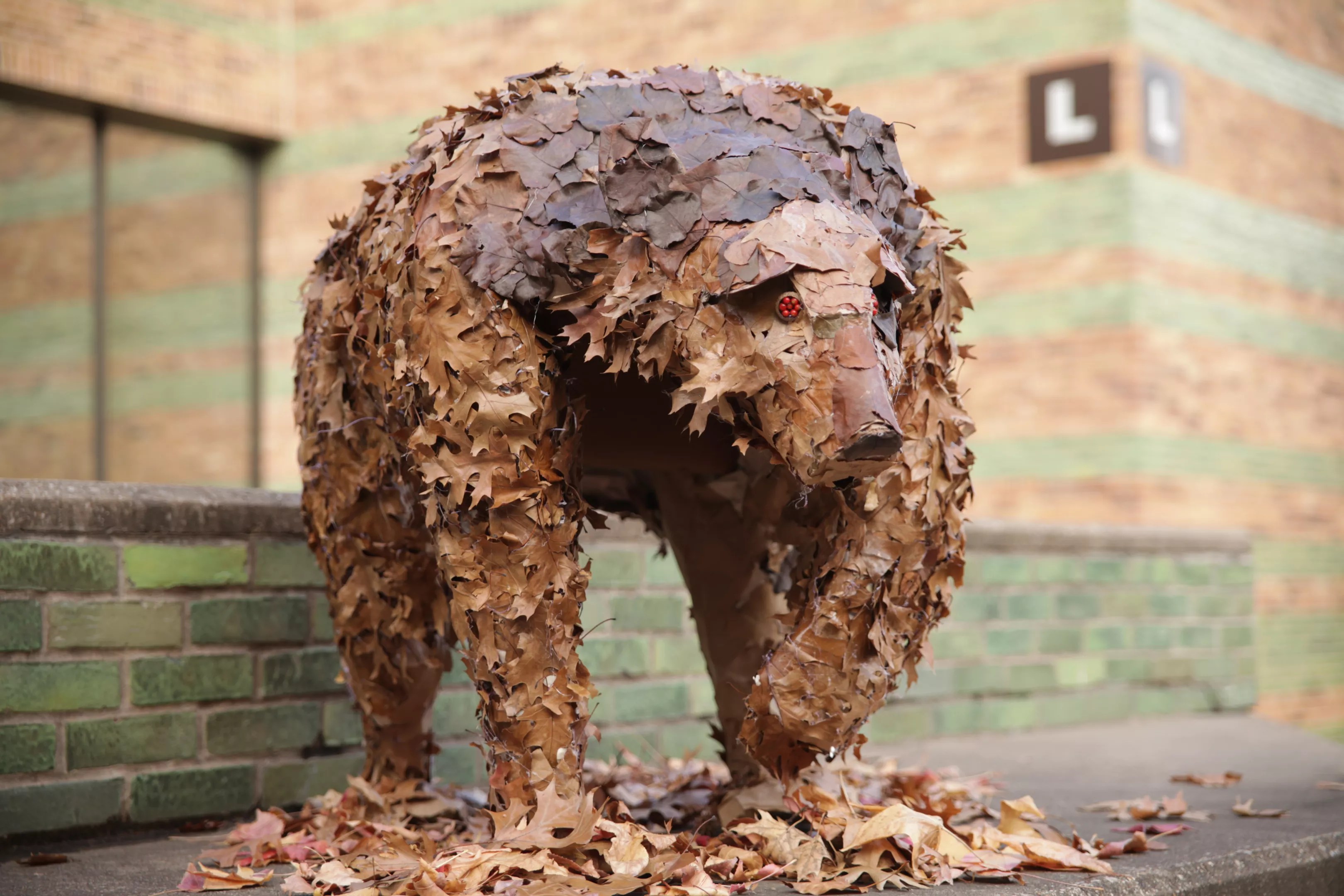 A few Brookhaven College students made the most of their final art project this week inspired by a campus full of fallen leaves. They created Franklin the bear, who is the size of a cub, and who could be seen standing outside of the L Building on the steps of the Commons Courtyard overlooking the fountain. Now the photos of the bear are being shared on social media accompanied by puns like “Unbearleafable,” which we’re not mad at.