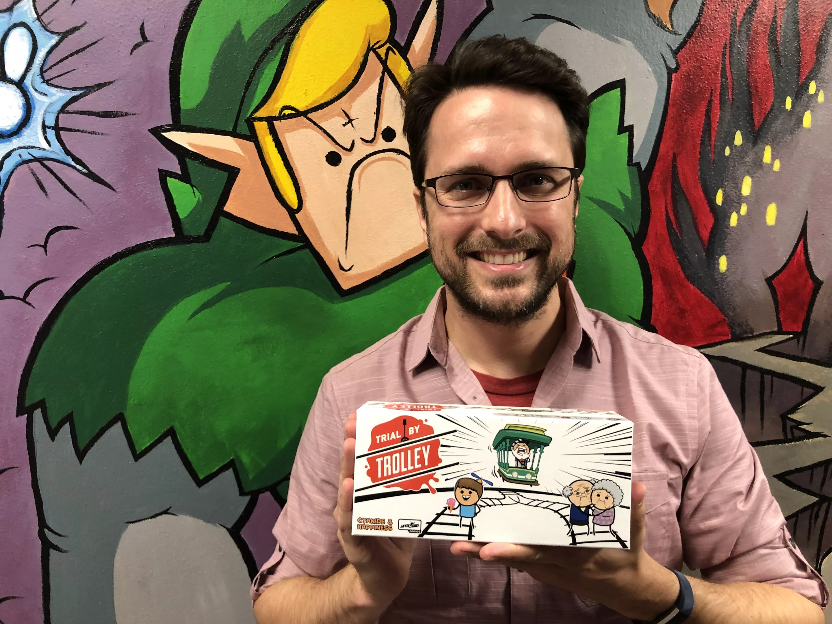 Cyanide & Happiness co-creator Rob DenBleyker shows off a copy of Explosm Entertainment and Skybound Games’ newest card game Trial By Trolley that will be in players’ hands by the end of the year.